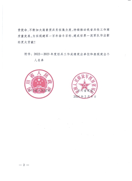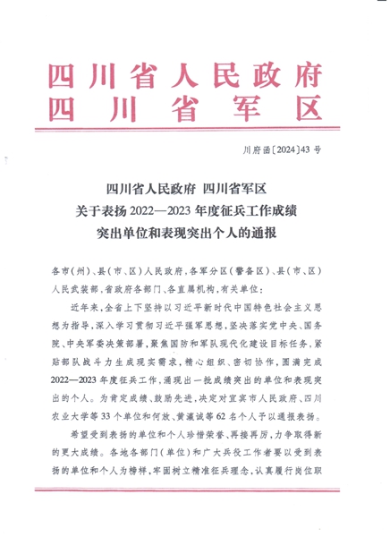 近日,四川省人民政府、四川省军区发布《关于表扬2022-2023年度征兵成绩突出单位和表现突出个人的通报》,申搏官网荣获全省大学生征兵工作成绩突出单位。