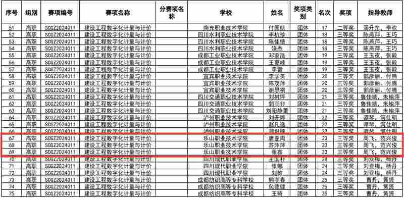 在2024年“中银杯”四川省职业院校技能大赛(高职组)建设工程数字化计量与计价赛项中,sunbet申搏官方网站代表队凭借出色的表现荣获三等奖,展现了学院在工程造价数字化领域的专业实力和教学成果。