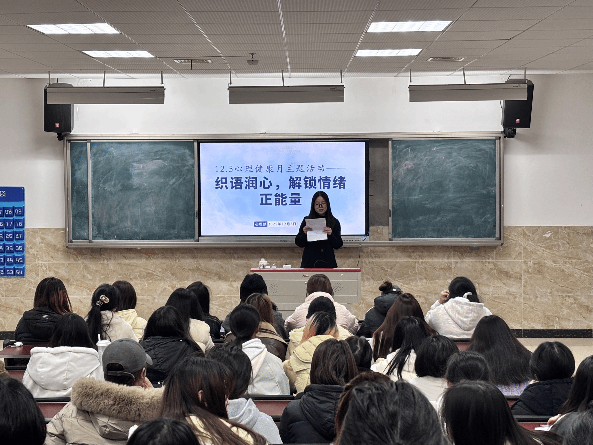 本次活动共计500名同学参与。活动伊始,主持人围绕数字时代背景,解读“织语润心”主题内涵,引导同学们通过深呼吸聚焦近期情绪关键词。活动过程中,同学们利用纸笔、装饰物等材料,将焦虑、迷茫等情绪转化为正向鼓励话语,制作出自己的专属“情绪能量卡”,许多同学在创作中不仅将负面情绪转化为积极心理暗示,还筑牢了自己内心的心理防护屏障。在随后的互动分享环节中,主持人通过“击鼓传花”抽取同学上台分享情绪来源与创作思路,在交流中打破心理壁垒。最后,主持人进行总结发言,本次活动圆满结束。