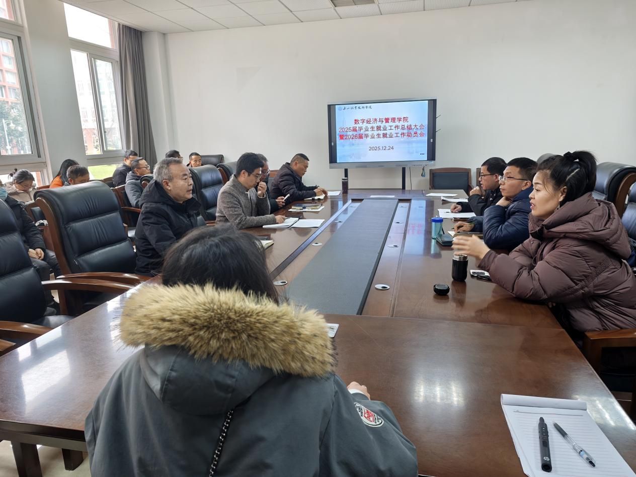 2025年12月24日下午,sunbet申搏官方网站数字经济与管理学院在2号教研楼110会议室召开数字经济与管理学院2025届毕业生就业工作总结大会暨2026届毕业生就业工作动员会。数字经济与管理学院党总支书记黄泓轲,院长邵其会,党总支专职副书记易新忠,副院长何瑞以及全体教师参加了会议。