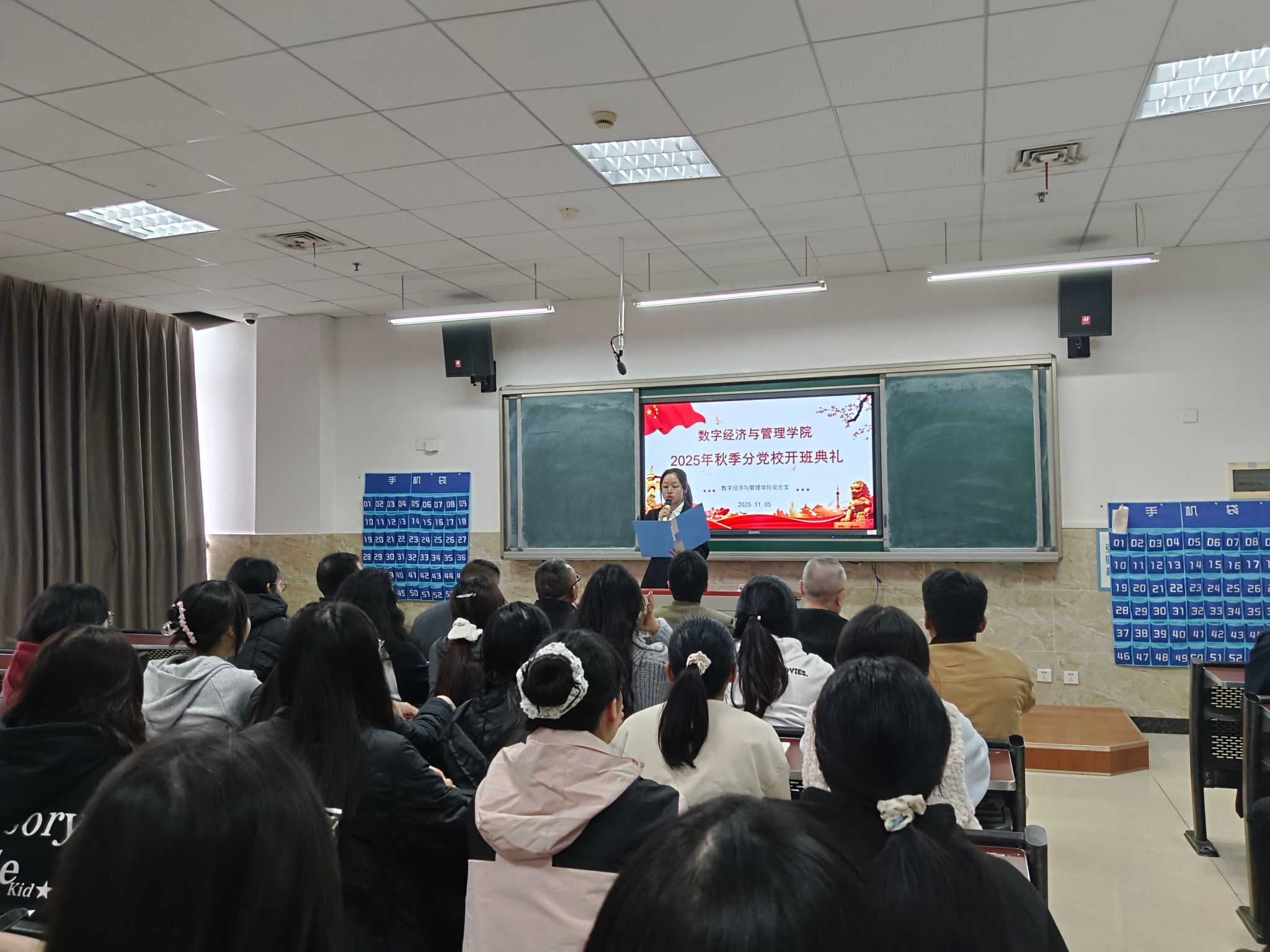 2025年11月5日中午,数字经济与管理学院党总支在1B404教室举行分党校2025年秋季培训班开班典礼,学院党总支委员、各党支部书记、院分团委书记及全体学员参加仪式,仪式由学院团委组织部部长任佳怡同学主持。