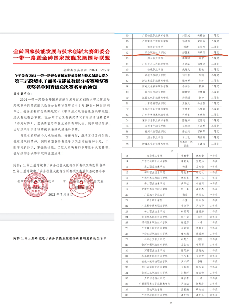2024年6月29-30日,“2024一带一路暨金砖国家技能发展与技术创新大赛·第三届跨境电子商务技能及数据分析赛项全国复赛”在线上举办。该赛项复赛为跨境电商B2B和B2C实践赛,涵盖了店铺基础建设、产品刊登发布管理、客户管理、店铺营销、交易管理、履约服务等综合业务操作。申搏官网2022级电子商务专业学生黄丹、万忠伦团队获高职组一等奖,成功晋级全国总决赛;彭馨慧、蒋明凤团队获高职组二等奖。武会玲、王琪担任本次大赛指导老师。