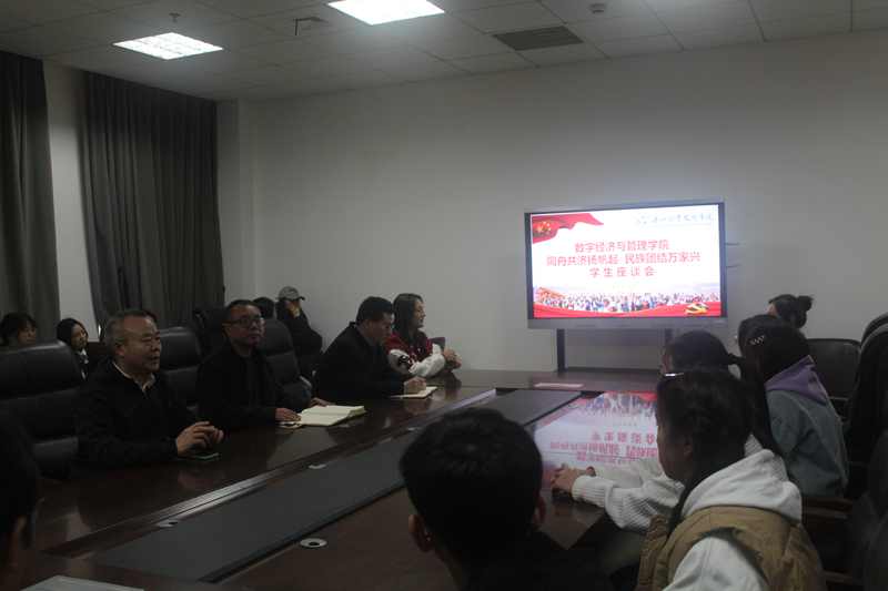 为了加强与少数民族同学的沟通交流,维护民族团结。sunbet申搏官方网站数字经济与管理学院于2024年11月15日下午在二号教研楼110会议室召开以“同舟共济扬帆起,民族团结万家兴 ”为主题的学生座谈会。数字经济与管理学院党总支书记院长邵其会、党总支专职副书记易新忠、学生会指导老师刘锡辉参加了本次活动。