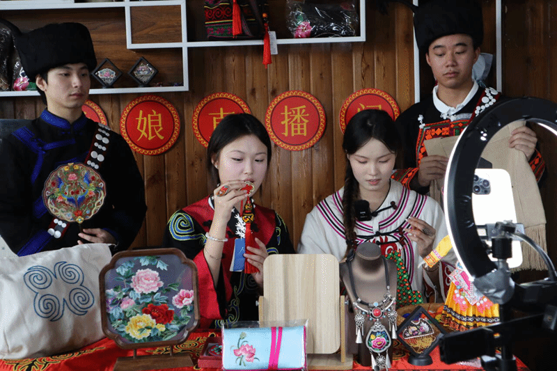 团队在前期调研的基础上,积极探索“推普+非遗”路径,电子商务专业的同学在工坊直播间进行现场直播,介绍推广彝绣产品,讲解纹样寓意、展示成品细节,一件件精美的彝绣手包、团扇、布鞋、挂饰……展示出独特的非遗技艺与民族文化。团队通过“普通话培训+电商直播”等形式,帮助非遗传承人突破语言壁垒,从指尖技艺到指尖经济,实现传统文化与现代经济的融合发展。