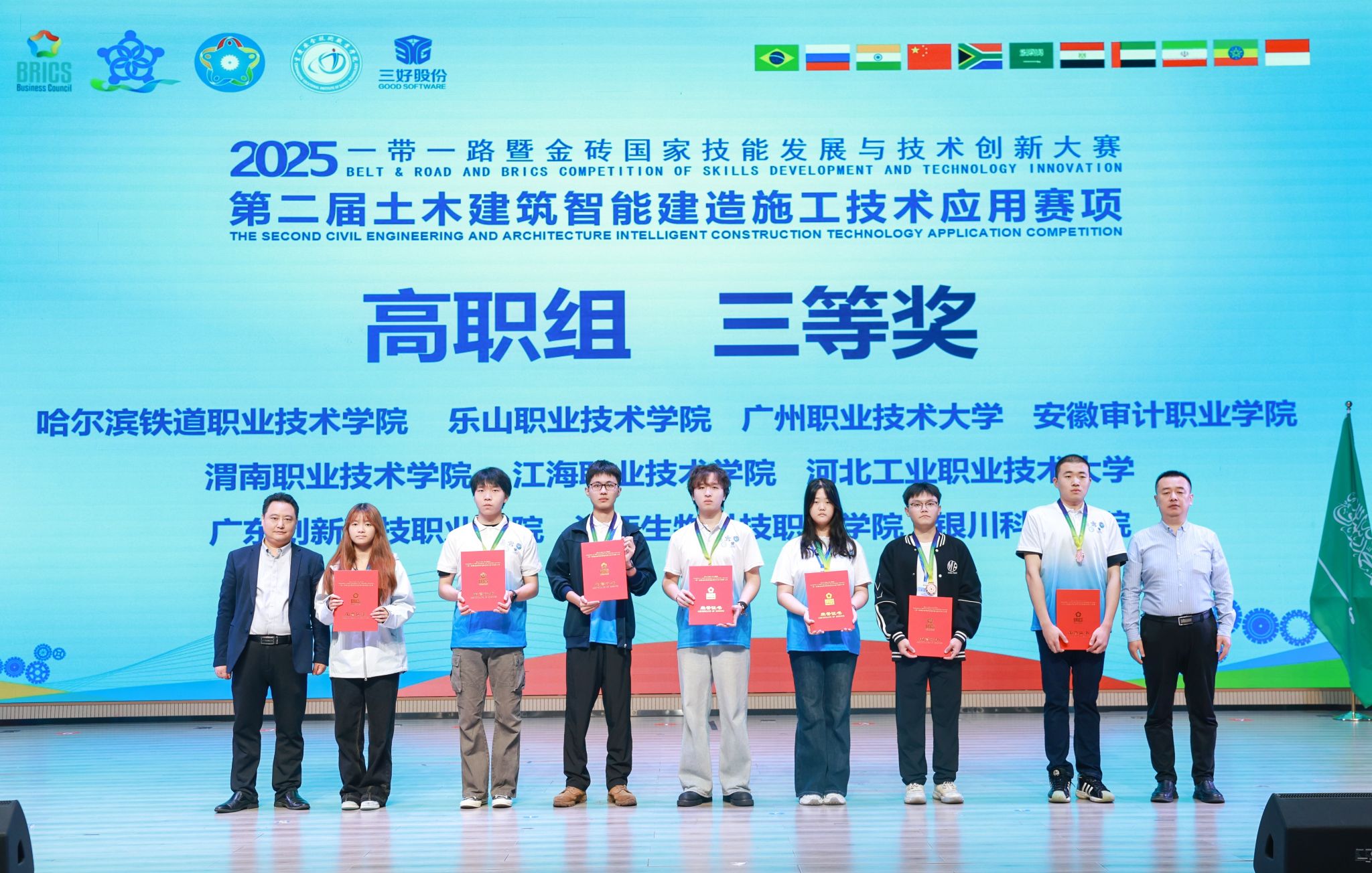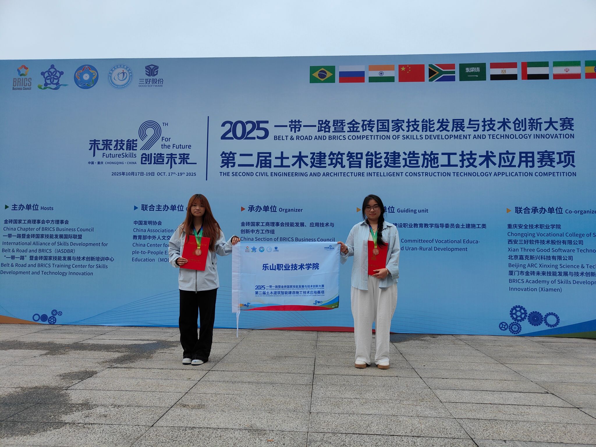 2025年10月17日—19日,2025“一带一路暨金砖国家技能发展与技术创新大赛”第二届土木建筑智能建造施工技术应用赛项高职组决赛在重庆万州落幕。sunbet申搏官方网站工程造价专业学生唐亚周、苏萍萍组成的学校代表队在区域选拔赛中突出重围,与进入决赛的全国289队选手同台竞技,最终斩获全国三等奖,实现专业在该项赛事上奖牌“零的突破”。