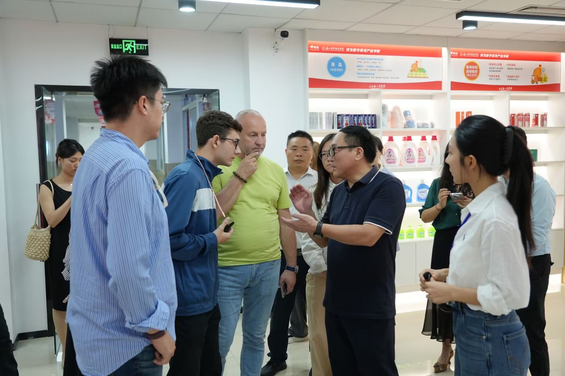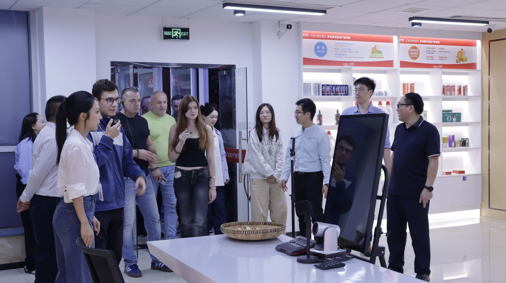 代表团一行深入京东数字商务产业学院,详细了解学院在跨境电商、网络直播等新兴领域的课程设置与人才培养模式。成定彬书记向代表团介绍了学院通过产教融合、校企合作服务区域经济发展的办学实践。在电商直播中心,外宾频频驻足观摩直播带货场景,并与师生展开亲切交流。