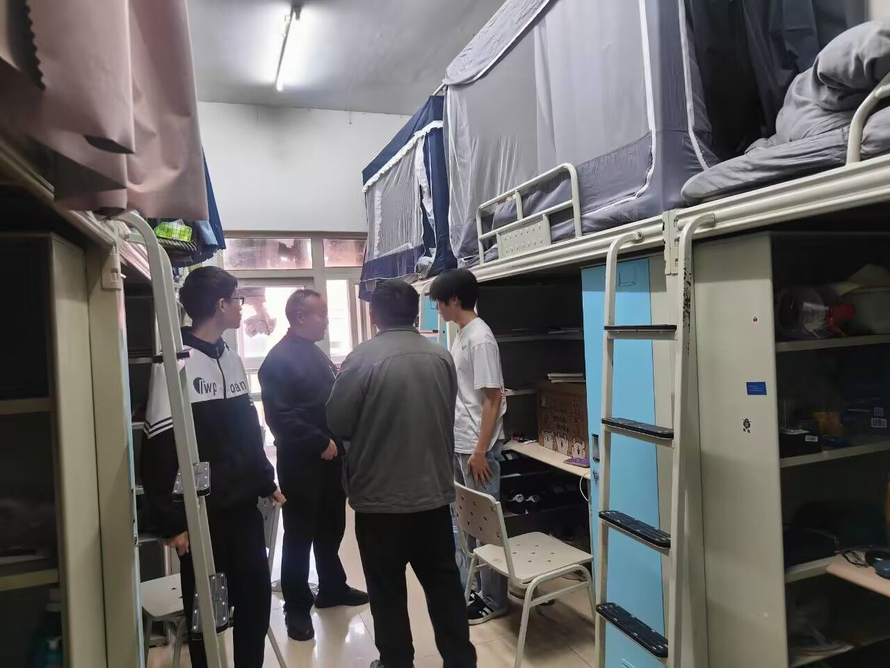 2025年10月29日下午,sunbet申搏官方网站数字经济与管理学院专职副书记易新忠带领学生管理办公室全体人员、专兼职辅导员以及自管会同学代表深入学生寝室,开展安全与卫生大检查。