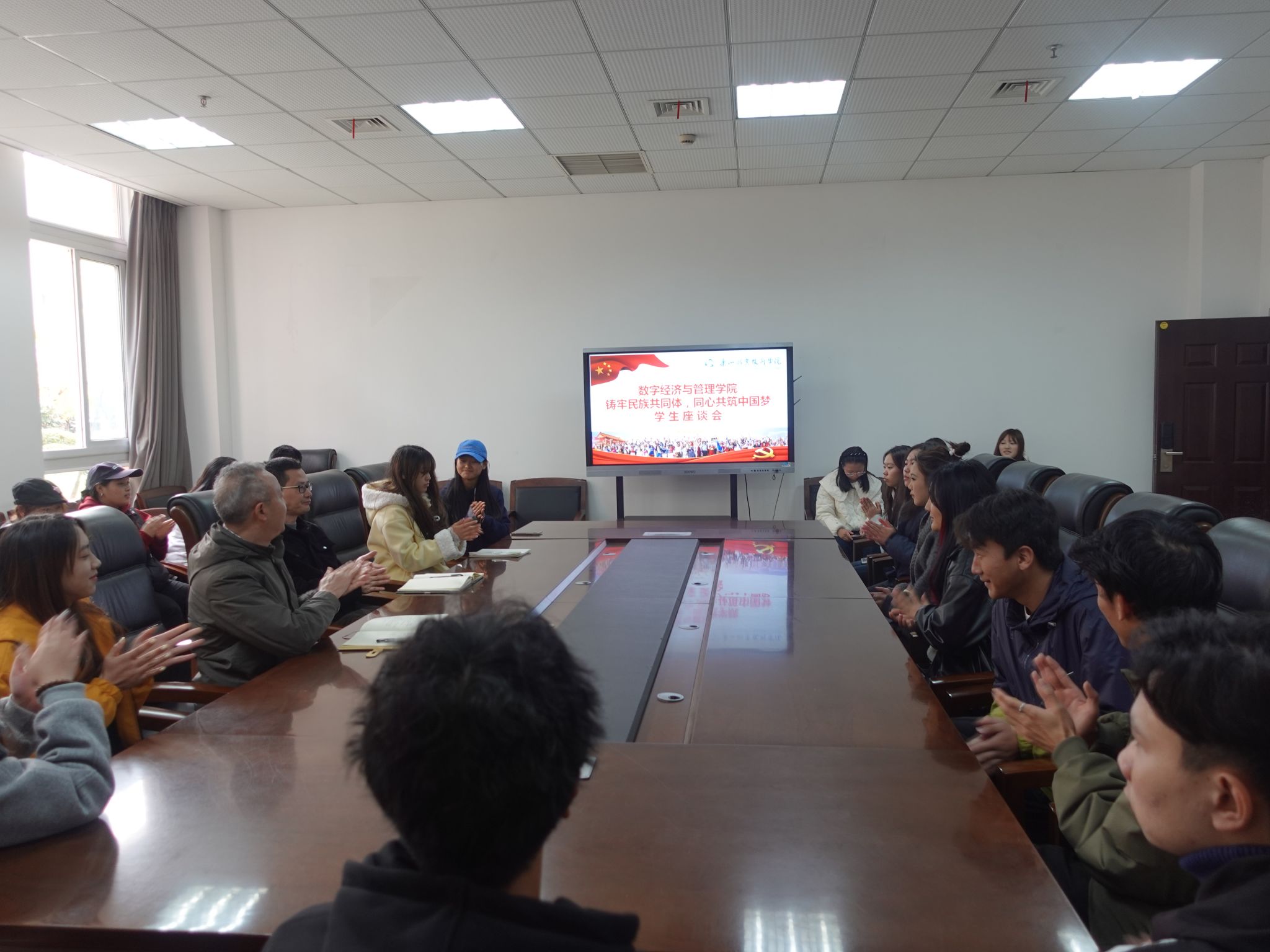 为深入贯彻习近平总书记关于加强和改进民族工作的重要思想,引导各族学生牢固树立"四个与共"的共同体理念,促进各民族学生交往交流交融。sunbet申搏官方网站数字经济与管理学院于2025年11月19日下午在二号教研楼110会议室开展以“铸牢中华民族共同体意识,同心共筑中国梦”为主题的座谈会。数字经济与管理学院专职副书记易新忠、负责学生工作的老师、各民族学生代表参会,会议由易新忠主持。