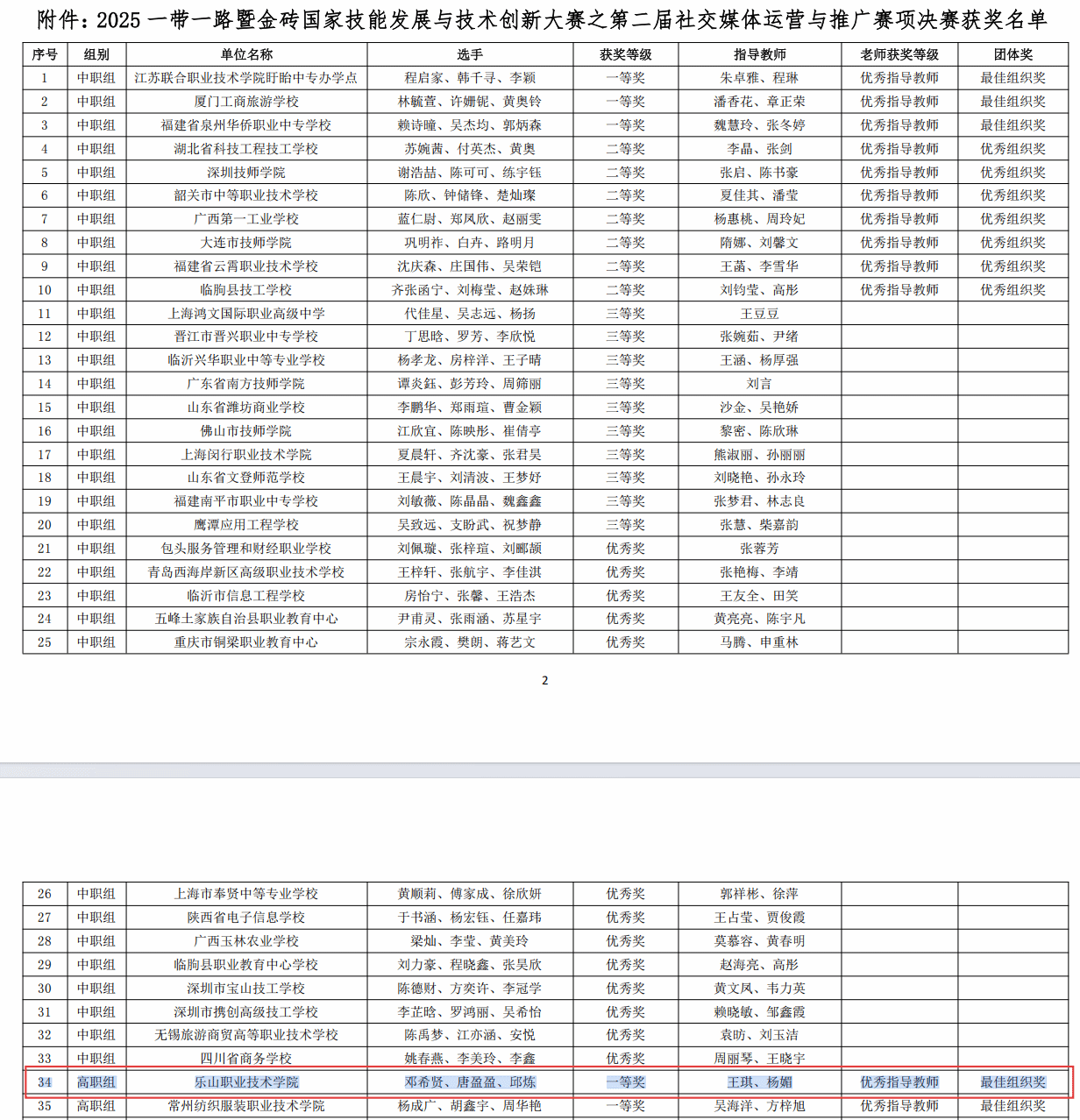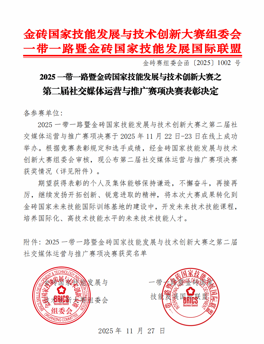 11月26日,2025一带一路暨金砖国家技能发展与技术创新大赛第二届社交媒体运营与推广赛项全国总决赛(高职组)圆满落幕。申搏官网数字经济与管理学院邓希贤、唐盈盈、邱炼组成的参赛团队一路披荆斩棘,以全国第一名的优异成绩斩获一等奖(金牌),指导教师王琪、杨媚荣获“优秀指导教师”荣誉称号。
