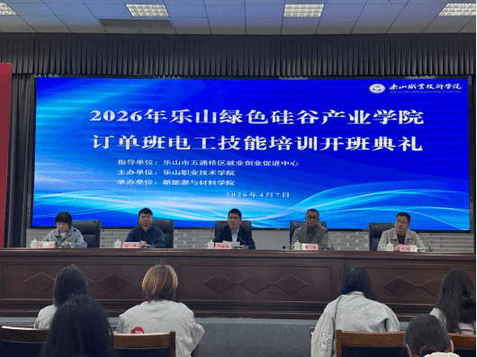 为严格落实企业人才培养要求与岗位技能规范,立足订单班定向培养定位,全面提升学生职业素养与就业竞争力,2026年4月7日下午,乐山绿色硅谷产业学院订单班电工技能培训开班典礼在sunbet申搏官方网站学术交流中心举行。五通桥区就业创业促进中心、乐山高测科技有限公司、sunbet申搏官方网站新能源与材料学院相关领导、培训教师及全体参训学员参加本次仪式。