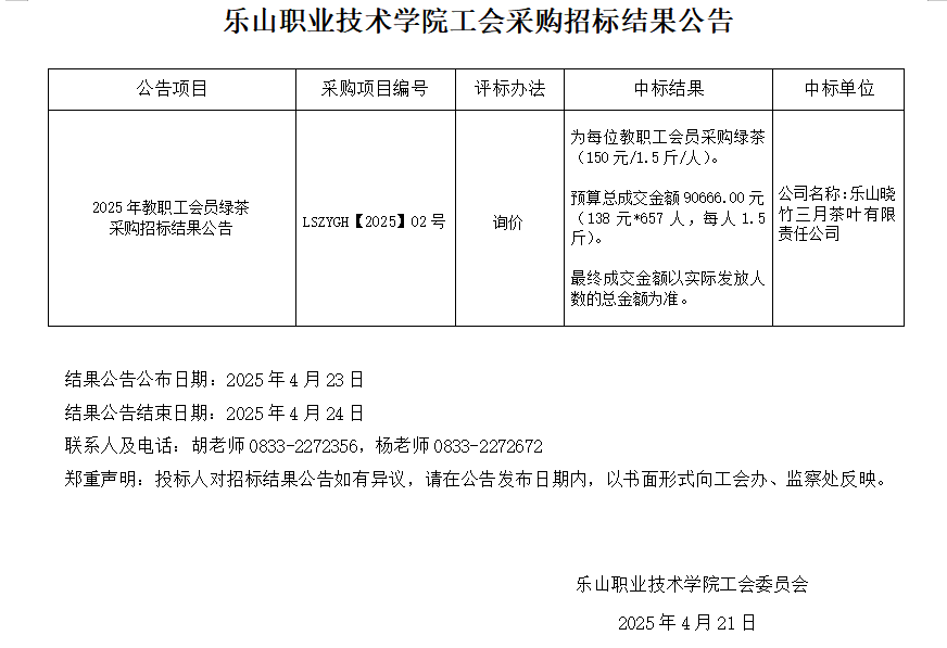 2025年教职工会员绿茶采购招标结果公告
