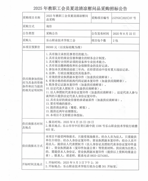 2025年教职工会员夏送清凉慰问品采购招标公告