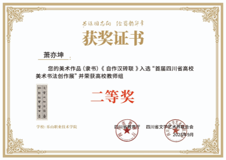 申搏官网职工书画协会老师萧亦坤获“首届四川省高校书法美术创作展”高校教师组二等奖。