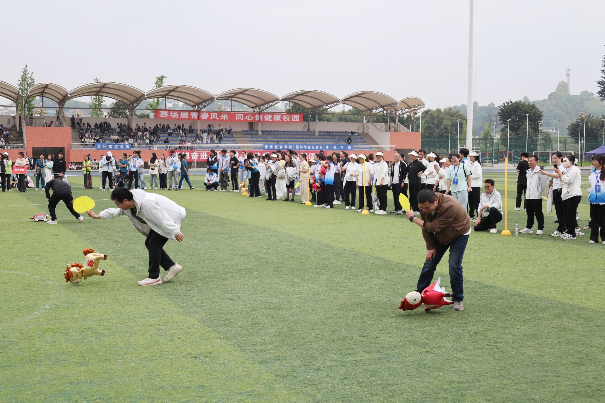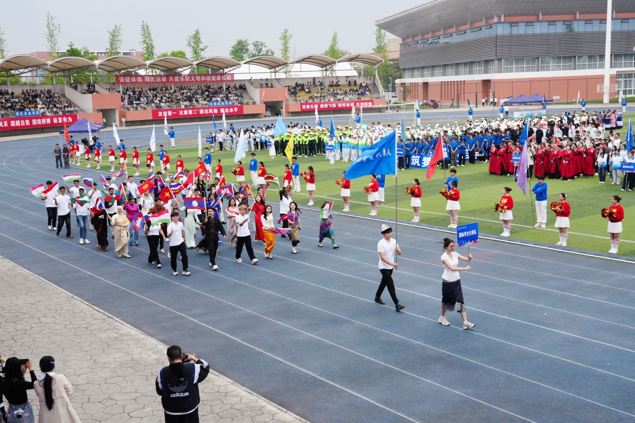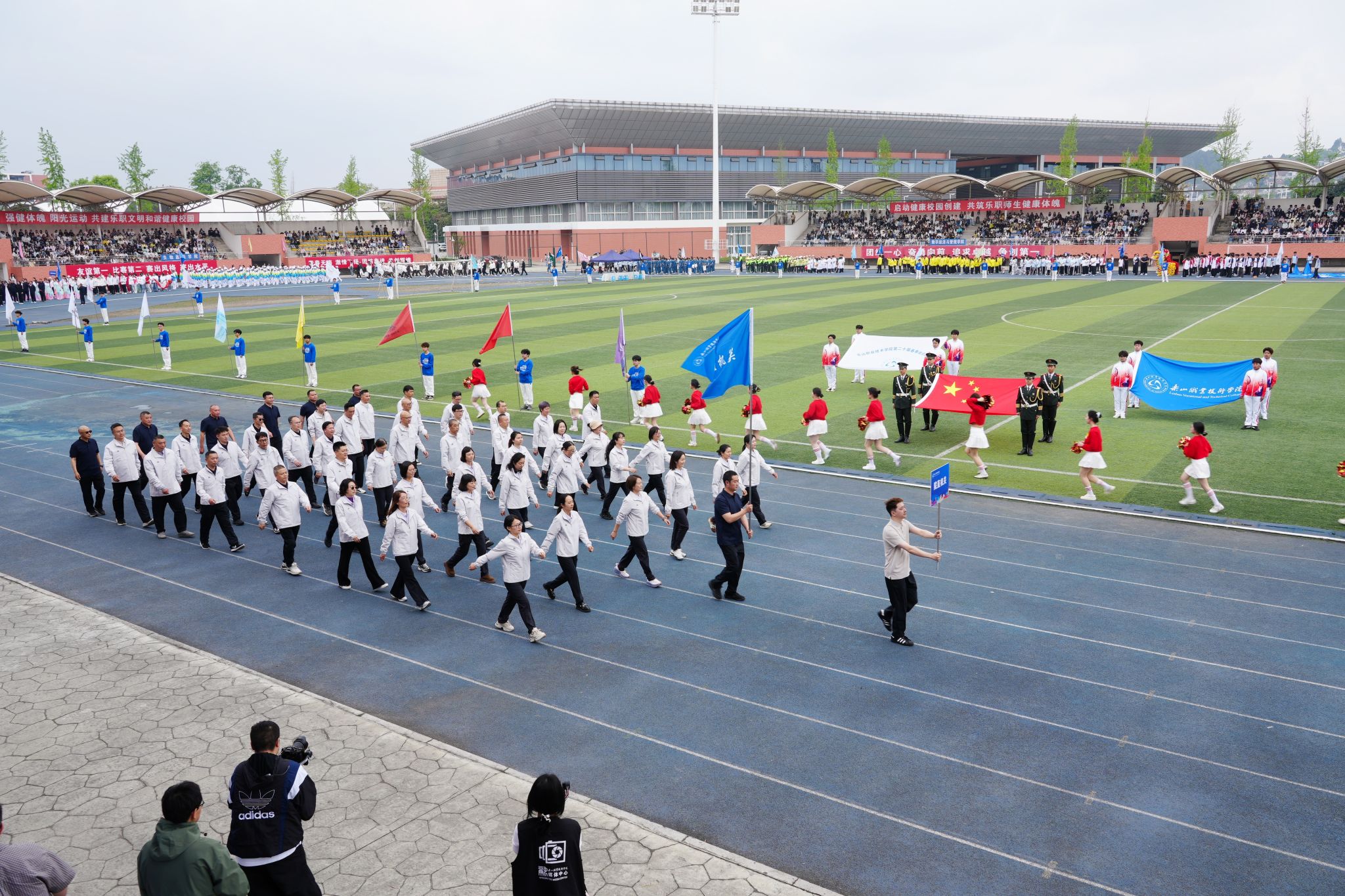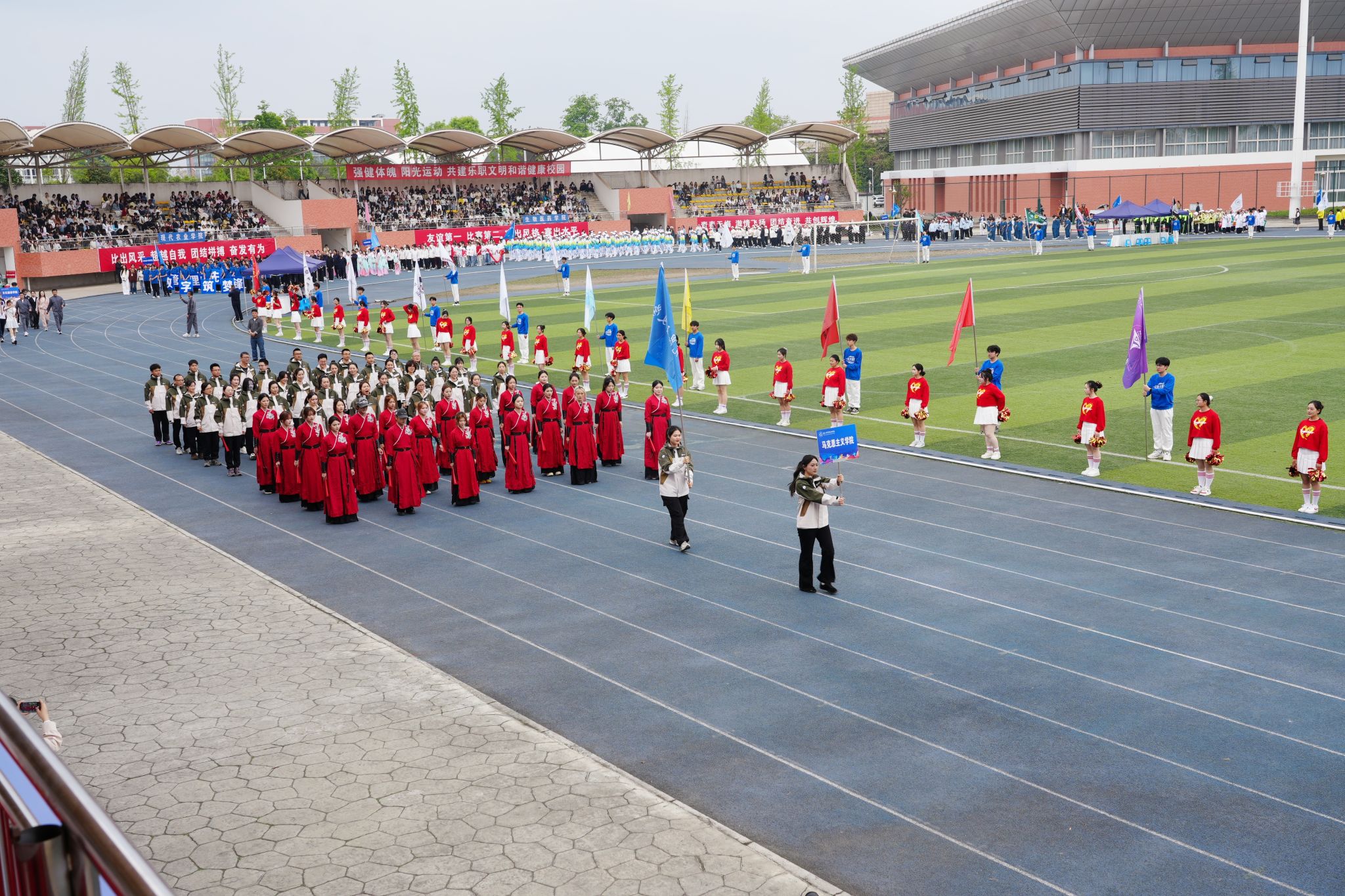 在激昂的《运动员进行曲》中,各方阵精神饱满、依次亮相:裁判员方队公正严谨、护航赛事;机关代表队服务师生、昂扬进取。马克思主义学院师生同心、铸魂育人;文化旅游学院彰显文旅担当,助力地方发展;数字经济与管理学院笃行实干、奋勇争先;生物医药学院中西相融、朝气蓬勃;护理康养学院七十余载薪火相传,医者仁心与非遗传承并举;医学学院白衣执甲、守护安康;现代农业学院扎根乡土、强农兴农;新能源与材料学院传承创新、科技向绿;智能制造学院精工致新、屡创佳绩;体育学院意气风发、勇攀高峰;人工智能学院以智逐梦、活力四射;素质教育学院中外携手、以文化人;国际学生代表队多元交融、尽展开放办学风采。 入场完毕,全场肃立,升国旗、奏唱国歌,庄严神圣。