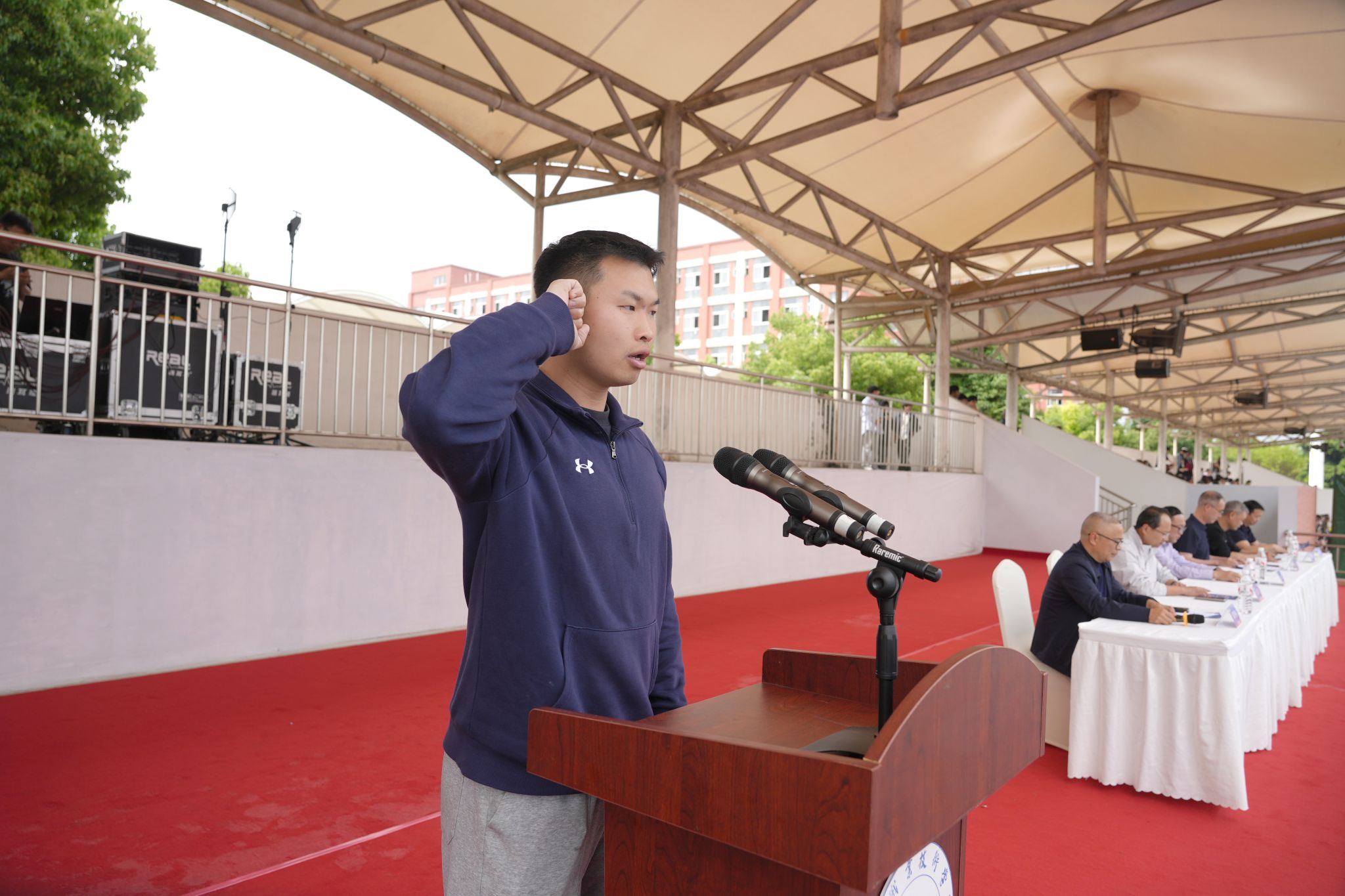 随后,裁判员代表、教职工代表、学生运动员代表依次上台宣誓。将严格遵守竞赛规程,恪守体育道德,坚持公平公正、顽强拼搏、文明参赛,共同维护赛场秩序,确保运动会安全、有序、圆满进行。