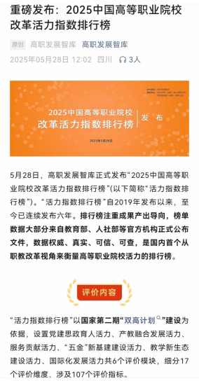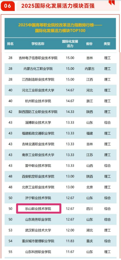 5月28日,高职发展智库正式发布了“2025中国高等职业院校改革活力指数排行榜”。申搏官网凭借在国际化发展方面的卓越表现,成功跻身“国际化发展活力模块TOP100”,位列第50名,在四川省内高等职业院校中表现亮眼。