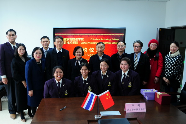2017年12月6日上午,泰国皇家吉拉达学校昆英校长、职教部主任萝拉珑、职业教育委员会顾问苏冉特、国际部助理部长王文龙一行来我院访问,双方在学院行政楼424会议室举行了交流座谈,学院党委副书记陈芝海,乐山市对外友好交流协会会长谭翙、友城科长杨承毅,学院国际合作处、教务处、旅游系、基础公共课程部负责人,国际合作处相关工作人员及来自泰国皇家吉拉达学校的5名交换生参加了此次交流座谈。会议由党(院)办主任、国际合作处处长黄晓莉主持。 座谈会上,陈芝海代表学院对昆英校长一行到访表示热烈欢迎。他回顾了我院与泰国多所高校及泰国皇家吉拉达学校的合作历史及合作7年来取得的丰硕成果,并介绍了我院搬入新校园后的总体情况。昆英校长就我院多年来对皇家吉拉达学校交换生的关照表示了感谢,介绍了泰国皇家吉拉达学校的教育理念、学制和专业特色等办学情况,并表达了希望与我院结为友好姊妹学校,让双方合作再上新台阶的愿望。乐山市对外友好交流协会会长谭翙对泰国客人来访表示欢迎,并祝愿双方的合作取得圆满成功。