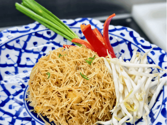 紧接着,我们在锅中舀入一勺酱汁,静待其变得浓稠。随后,将提前过水并与蛋液完美融合的面条加入锅中,迅速翻炒。在锅铲的不停翻动下,面条逐渐变得金黄酥脆,散发出阵阵令人垂涎的香气。最终,我们将炒好的面条盛于盘中,精心搭配上提前准备的配菜,一道色香味俱佳的泰式炒面便呈现在眼前。迫不及待地品尝一口,酸甜的滋味在口中散开,面条酥脆易化,令人回味无穷。