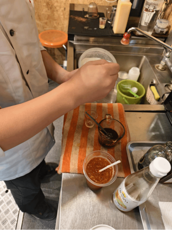 抵达学校后,我们与爱老师亲切寒暄,随后一同去领取烹饪所需的原料。在泰式炒面的制作中,酱料堪称关键之所在。爱老师耐心细致地为我们讲解,泰式炒面的酱料用料丰富繁杂,通常人们会一次性制作大量酱料并妥善保存。剩余的酱料若通过冰箱合理储存,甚至可使用长达一年之久。在爱老师的悉心指导下,我们分工协作,有人负责切配调料,有人专注于搅拌混合,不久后,浓郁诱人的酱料便大功告成。