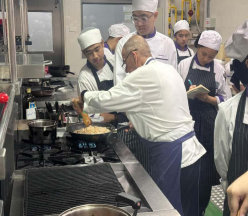 7月21日上午,潘老师教我们鸡肉和海鱼的分解技巧。面对摆在面前的整鸡和海鱼,一开始我还有些无从下手,但潘老师一步步耐心地示范,讲解每一个部位的特点和分解方法。分解鸡肉时,先找准关节的位置,用锋利的刀轻轻切开,将鸡胸肉、鸡腿、鸡翅等部位完整地分离出来,同时还教我们如何处理鸡骨,以获取更多可用的食材。分解海鱼时,先去除鱼鳞,再沿着鱼背将鱼剖开,小心地取出内脏,然后根据鱼的大小和烹饪需求,将鱼肉切成合适的块状。在老师的指导下,我逐渐熟练起来,顺利完成了分解任务。下午,我们用分解好的鸡肉教泰国同学们做中国菜黄焖鸡。我先将鸡肉切成大小均匀的小块,放入锅中焯水去腥,捞起备用。接着在热油锅中放入姜片、葱段、干辣椒爆香,加入鸡肉块翻炒至表面金黄,再依次加入香菇、土豆、青椒等配菜继续翻炒。随后加入生抽、老抽、蚝油、料酒、冰糖等调料,倒入适量清水,盖上锅盖小火焖煮20分钟左右,直到鸡肉和配菜都变得软烂入味,汤汁浓稠。泰国同学们围在旁边,好奇又认真地学习每一个步骤,时不时提出问题,我也耐心地一一解答。当黄焖鸡的香味弥漫开来,大家都迫不及待地品尝起来,他们对这道中国美食赞不绝口,纷纷竖起大拇指,那一刻,我心中充满了自豪,也感受到了美食作为文化交流桥梁的魅力。