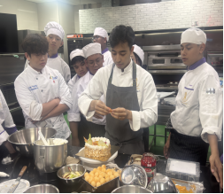 7月22日上午,又是跟着潘老师学习的一天,这次的课程是水果蛋糕制作。准备材料时,看着新鲜的草莓、芒果、蓝莓等水果,就已经让人充满期待。先制作蛋糕胚,将鸡蛋、面粉、牛奶、黄油等材料按照一定比例混合搅拌,经过打发、搅拌等一系列步骤后,倒入模具放入烤箱烘烤。等待蛋糕胚出炉的过程中,我们开始制作奶油,将淡奶油打发至浓稠状,加入适量细砂糖调味。蛋糕胚烤好后,待其冷却,把奶油均匀地涂抹在蛋糕表面和夹层,再将切好的水果精心地摆放上去进行装饰。一个个漂亮又美味的水果蛋糕就完成了,香甜的蛋糕搭配新鲜的水果,口感丰富,甜而不腻。下午跟随意大利老师学习意大利烩饭,老师先介绍了意大利烩饭常用的米以及独特的烹饪方法。制作时,先用黄油将洋葱丁炒香,加入意大利米翻炒,让米粒均匀地裹上黄油,接着慢慢倒入热鸡汤,一边倒一边搅拌,确保每一粒米都能吸收到汤汁。在这个过程中,需要不断观察米粒的状态和汤汁的浓稠度,适时调整火候。当米粒煮至口感恰到好处时,加入提前炒好的蔬菜、肉类或海鲜,再撒上芝士碎,搅拌均匀,让芝士融化在烩饭中,增加浓郁的奶香味道。最后装盘,再撒上一些香草碎作为点缀,一道正宗的意大利烩饭就呈现在眼前,品尝着自己做的烩饭,感受着意大利美食的独特魅力。
