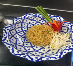 7月16日上午,阳光透过厨房明亮的窗户洒在操作台上,我们怀着期待的心情迎来了泰式炒面制作课程,授课的是亲切又专业的艾老师。制作前,艾老师先为我们展示了所有食材,有泡发好的泰国干米,色泽粉嫩、新鲜饱满的大虾,散发着独特气息的泰式鱼酱,还有鲜鸡蛋、泰式辣椒酱、豆腐、腌制甜萝卜等丰富配料 。在艾老师细致的讲解下,我们正式开始动手。我先将新鲜的大虾去皮,把鲜鸡蛋打碎在碗里备用,再把豆腐切成1厘米见方的小方块,将中国细葱切成3厘米长的葱段,洗净的豆芽放在一旁。调制秘制泰式调味汁时,把罗望子糊、椰糖、泰式鱼酱、泰式辣椒酱一起放入平底锅,小火焖煮5分钟,期间那独特又浓郁的香味不断飘散出来,勾得人食欲大增。接着起油热锅,放入处理好的虾快速翻炒,直至虾肉变成诱人的红色,随后加入泡发好并沥干水分的面条和打碎的鸡蛋,不停搅拌,让鸡蛋均匀地裹在面条上并充分煮熟。再依次加入虾干、豆腐以及提前用水焯熟的萝卜,充分搅拌几分钟后,放入葱段、豆芽以及调制好的秘制调味汁,继续烧煮几分钟,让食材完全入味,最后滴入少许鲜鸡汁提鲜。起锅装盘,撒上研磨好的花生碎末,一盘色香味俱全的泰式炒面就完成了。品尝着自己亲手制作的泰式炒面,酸甜香辣的丰富口感在舌尖上跳跃,真的超级满足。