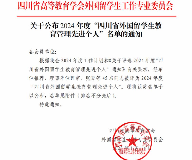 根据四川省高教学会外国留学生工作专业委员会评优工作部署,申搏官网于2024年12月依规开展“外国留学生教育管理先进个人”前期选拔工作。经专委会依据既定评审标准,对申报材料及工作成绩进行细致严谨评审,申搏官网教师卢妮娜、邱科最终获授2024年度“四川省外国留学生教育管理先进个人”荣誉称号。