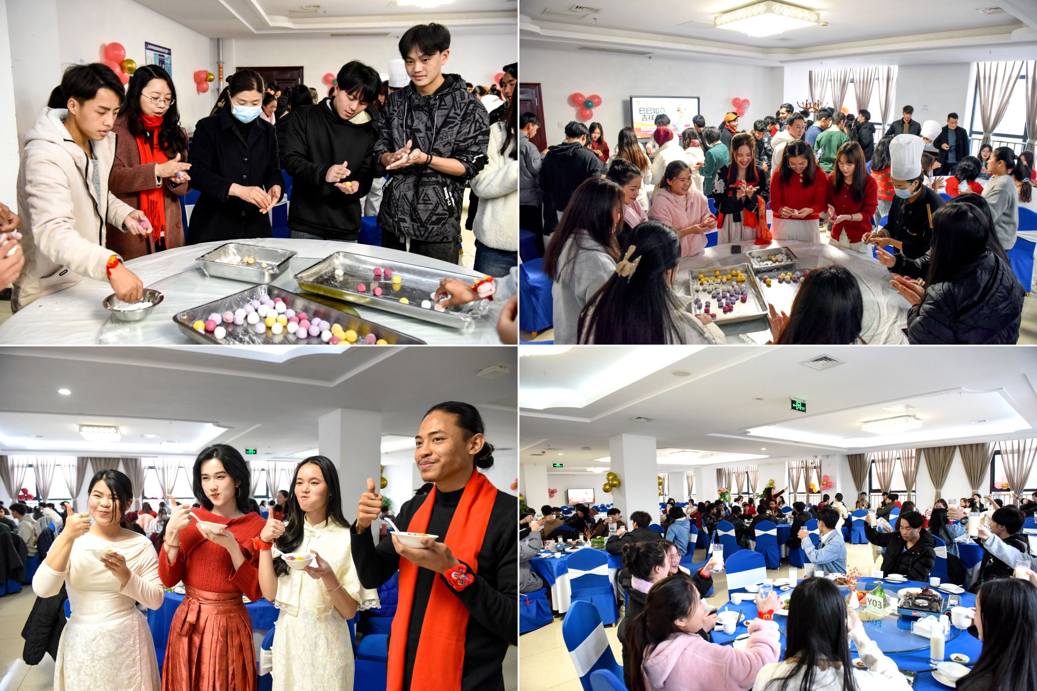 随后,工作人员将包好的汤圆煮熟,连同准备好的丰盛中餐一起端上餐桌,留学生品尝着自己亲手制作的汤圆和中国传统美食,感受春节团圆饭的氛围。就餐过程中,留学生们还分享了自己对春节文化的感受和体验,学校教师也送上节日祝福,现场其乐融融。