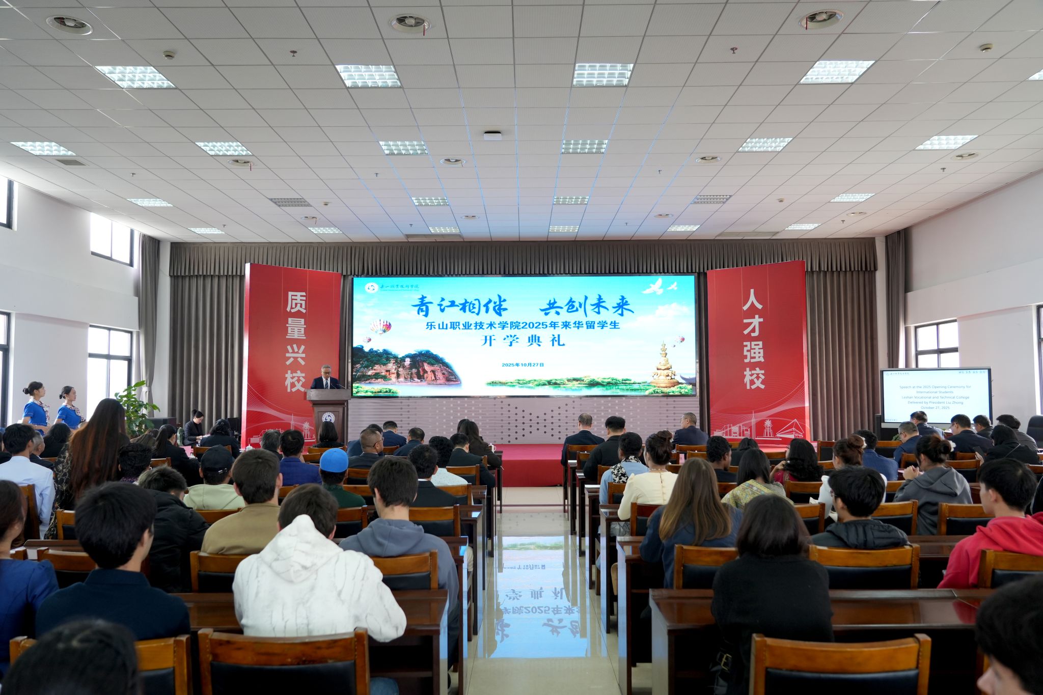 In the golden autumn of October, sweet osmanthus blooms everywhere. On the morning of October 27, the Opening Ceremony for 2025 International Students of Leshan Vocational and Technical College, themed “Together by Qingjiang, for a Shared Future”, was solemnly held in Room 3004 of the Academic Exchange Center.