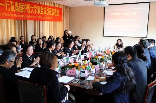 On October 17th, a delegation of over 40 deans and representatives from the Central Alliance II and Northern Alliance of Thai Nursing Universities, comprising nine universities in total, visited our college for an exchange. A symposium was held in the conference room on the third floor of our college. Attending the symposium were Jie Lu, Secretary of the Party Committee, Liu Zhong, President of the college, Chen Zhihai, Deputy Secretary of the Party Committee and Discipline Inspection Secretary, as well as heads and relevant staff from the International Office, Academic Affairs Office, Legal Affairs Office, Human Resources Office, Research Office, and Nursing Department. The meeting was chaired by Comrade Chen Zhihai, Deputy Secretary of the Party Committee and Discipline Inspection Secretary.