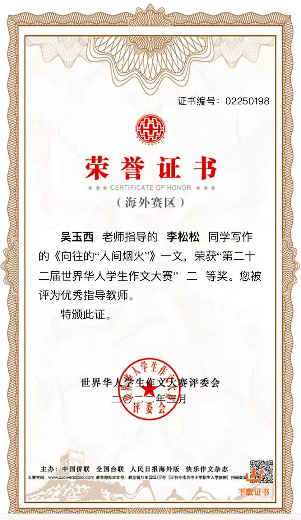 The 22nd World Chinese Students' Composition Contest was jointly organized by the All-China Federation of Returned Overseas Chinese, the Taiwan Democratic Self-Government League, the Overseas Edition of the People's Daily, and the Happy Composition magazine. Since its launch in September 2021, the contest lasted for over six months and attracted more than 3 million Chinese students from 45 countries and regions.