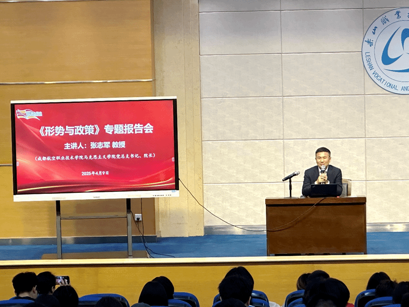 On the afternoon of April 9, 2025, Professor Zhang Zhijun, a guest professor at Leshan Vocational and Technical College, and the Party Branch Secretary and Dean of the School of Marxism at Chengdu Aeronautics Vocational and Technical College, delivered a special report on "Situation and Policy" in the Academic Report Hall. Over 150 participants attended, including teachers of ideological and political courses from the School of Marxism and student representatives from the Marxist-Leninist societies of various secondary colleges.