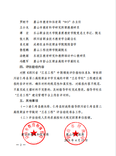 4月16日至17日,受眉山市教育和体育局邀请,作为评估专家组成员,赴仁寿第二职中开展“三名工程”(名校、名专业、名实训基地)评估验收。通过查阅资料、师生访谈、基地考察等方式,在验收的同时提出了一系列改进建议,助力学校高质量通过省级验收。此前的3月31日至4月3日,受遂宁市职业技术学校邀请,就该校“三名工程”迎检工作进行了深度指导。