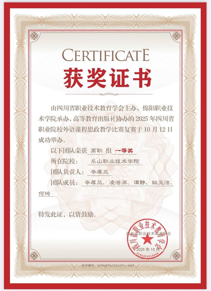 10月12日,2025年四川省职业院校外语课程思政教学比赛决赛圆满落幕。经过激烈角逐,申搏官网素质教育学院英语教师辛厚兰、凌浩源、谭静、姚玉洁、何琦组成的参赛团队凭借其深刻的课程思政内涵、创新的教学设计以及精彩的现场发挥,最终获得高职组一等奖的优异成绩。这一佳绩充分展现了申搏官网在外语课程思政教学改革上的显著成果。