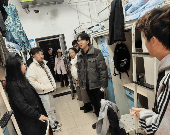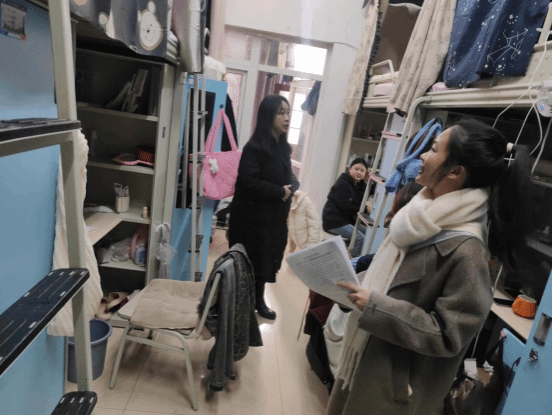 在巡视检查过程中,大部分寝室空气流通,地面桌面整洁,卫生情况良好。罗书记和辅导员们不仅关切地询问了同学们学习和生活情况;也对个别安全隐患问题耐心解释、明确要求;同时嘱咐同学们离校前要关闭电器设备、关闭门窗、倾倒垃圾,做好卫生清洁。在交谈中,罗书记还询问同学们离校的交通工具、假期安排,围绕诚信应考、人身财物、食品交通、人员交往、防诈防骗等方面,与同学们亲切交谈,气氛十分融洽。