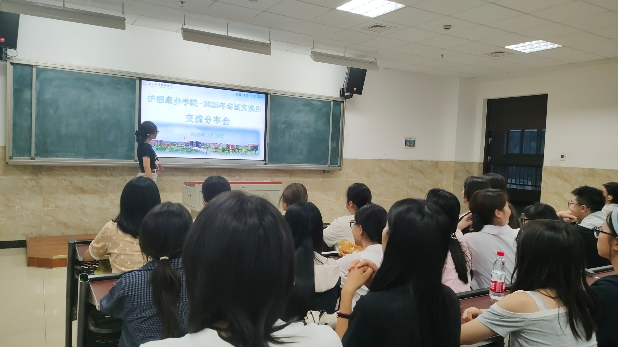 2025年10月16日,护理康养学院开展泰国红十字护理学院交换生交流分享会在教学楼2C401教室如期举行。本次交流会由参加了泰国红十字护理学院交换生项目的王帅岚、陈昕然两位同学作为主讲,24级、高职22级、25级护理专业共200名学生参与,现场座无虚席,一场以“走进泰国交换生项目,开启国际交流之旅”为主题的成长盛宴,就此拉开帷幕。