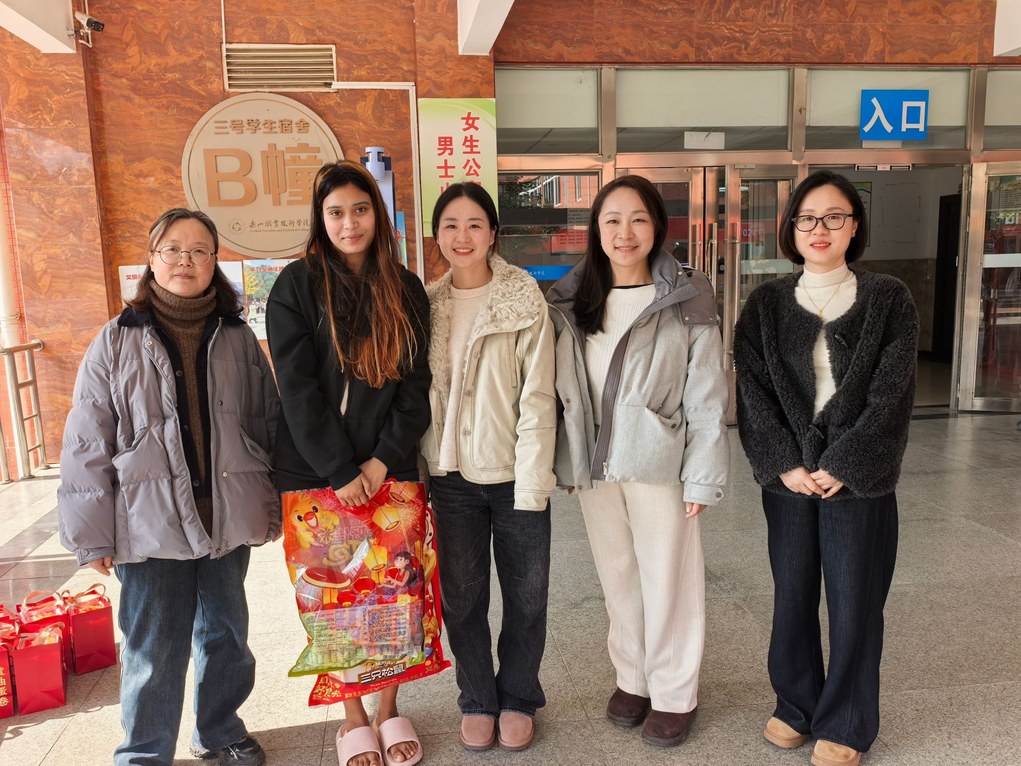 新春将至,年味渐浓。为切实做好寒假期间留校留学生的关怀服务工作,让远离家乡的国际学生在校园度过温暖、平安、祥和的节日,近日,sunbet申搏官方网站护理康养学院党总支书记罗健玮带队,学工部副部长黎缘、国际交流与合作处王湘琦老师、护理康养学院党总支副书记邱科及辅导员李玉琴、伍祝君老师一行,专程看望慰问寒假留校留学生伊娜雅、林赛、莫西乌尔,为他们送上新春祝福与学校的暖心关怀。