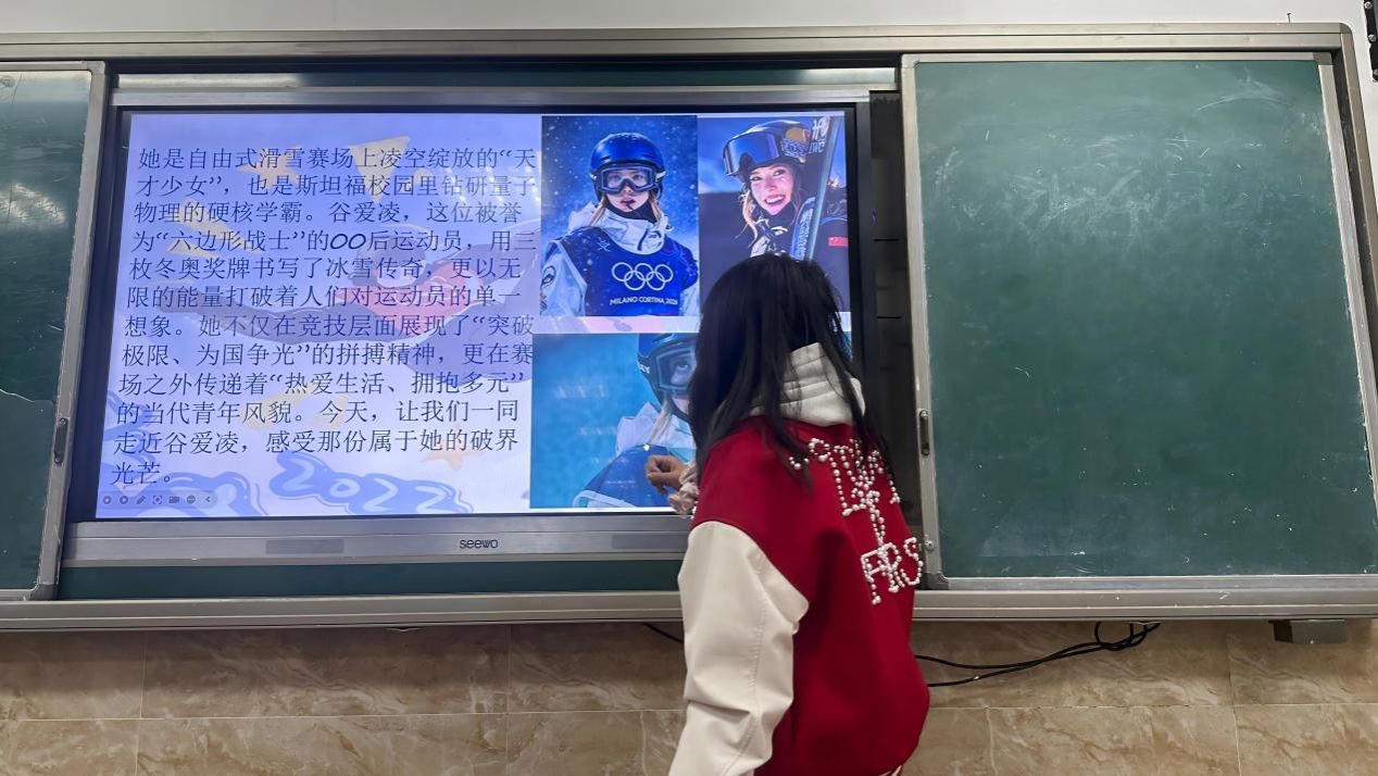 活动伊始,主持人以“突破极限,光芒自现”为引,深入解读“破界・光芒”的核心内涵,摒弃体育竞技“唯结果论”的片面认知,点明“破界”是身心双重突破、挑战自我极限的勇气,“光芒”则是拼搏过程本身的价值,是坚持与突破凝聚的精神力量。核心分享环节,主持人讲述谷爱凌跳出舒适圈、打破固有思维的励志故事:在北京冬奥会女子自由式滑雪决赛中,她放弃保守保牌的稳妥方案,大胆挑战从未在正式比赛完成的1620超高难度动作,用无畏抉择诠释了“破界”的真正意义。活动尾声,主持人作出总结,寄语全体同学将破界精神融入日常学习与生活,勇敢突破自我边界,以热爱与坚持绽放青春光芒。