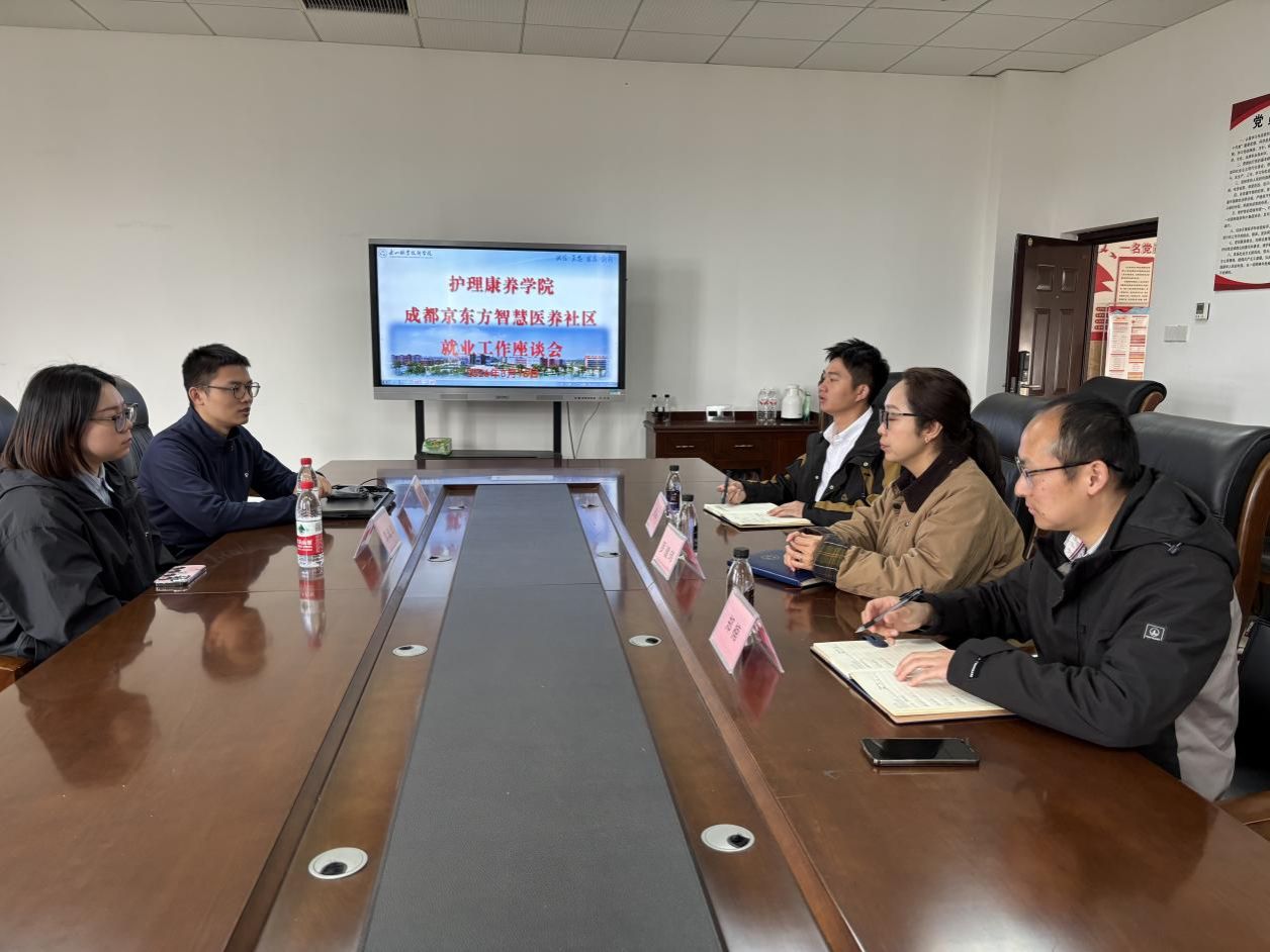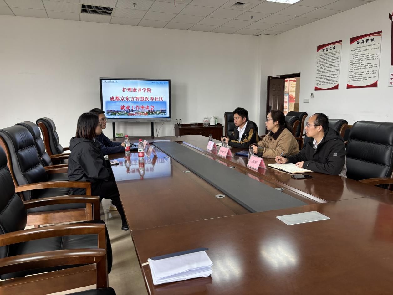为深入贯彻落实国家职业教育改革部署,进一步推动产教融合走深走实,拓宽协同育人路径,2026年3月16日中午,护理康养学院在二号教研楼301会议室与成都京东方智慧医养社区联合举办访企拓岗促就业座谈会。成都京东方智慧医养社区人事专员张晏祥、照护主管覃瑶琴一行到访交流,学院党总支书记罗健玮、副书记邱科、实习就业科科长郑楠参加座谈。