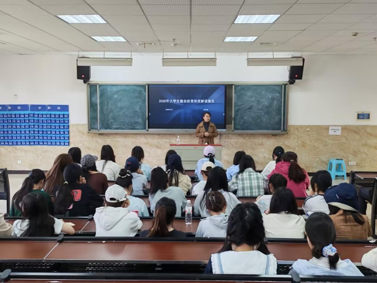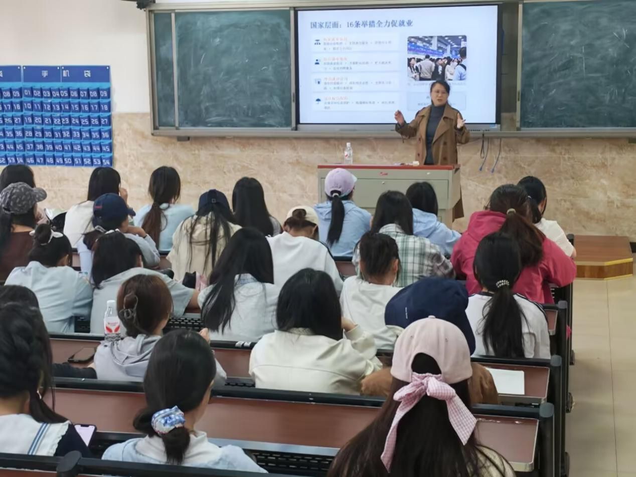 讲座中,范学科老师结合当前大学生就业特点及行业发展现状,围绕同学们普遍关心的就业、升学、实习等核心问题,进行了系统而深入的讲解。她从宏观层面分析了当前就业市场的基本形势,梳理了多元化的就业去向与发展前景;同时,聚焦实习单位选择、实习能力提升、求职技巧运用等关键环节,提供了具体、实用的指导建议,帮助同学们在职业发展道路上少走弯路。