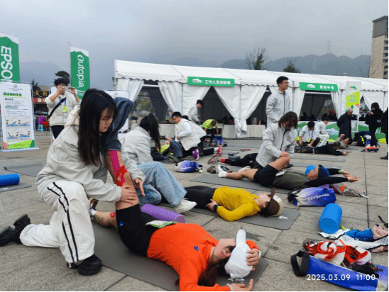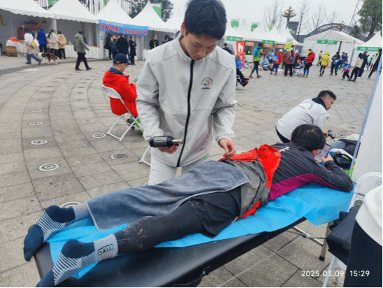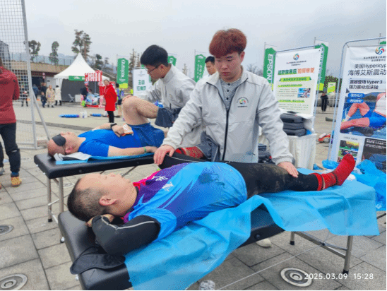 3月9日赛事当天,师生团队在赛道终点设立康复服务站。上午10时许,一名27公里组选手因小腿肌肉痉挛无法行走,学生团队迅速运用培训所学的“扳机点按压技术”,配合冰敷处理,仅15分钟便缓解选手疼痛。下午1点,终点63公里组冠军选手冲线,学生们积极观摩学习,积累了宝贵的专业运动员康复案例经验。