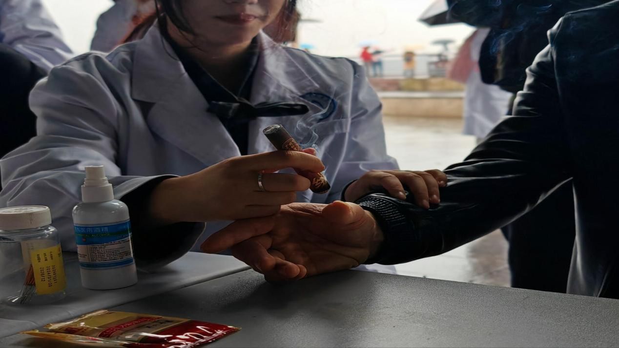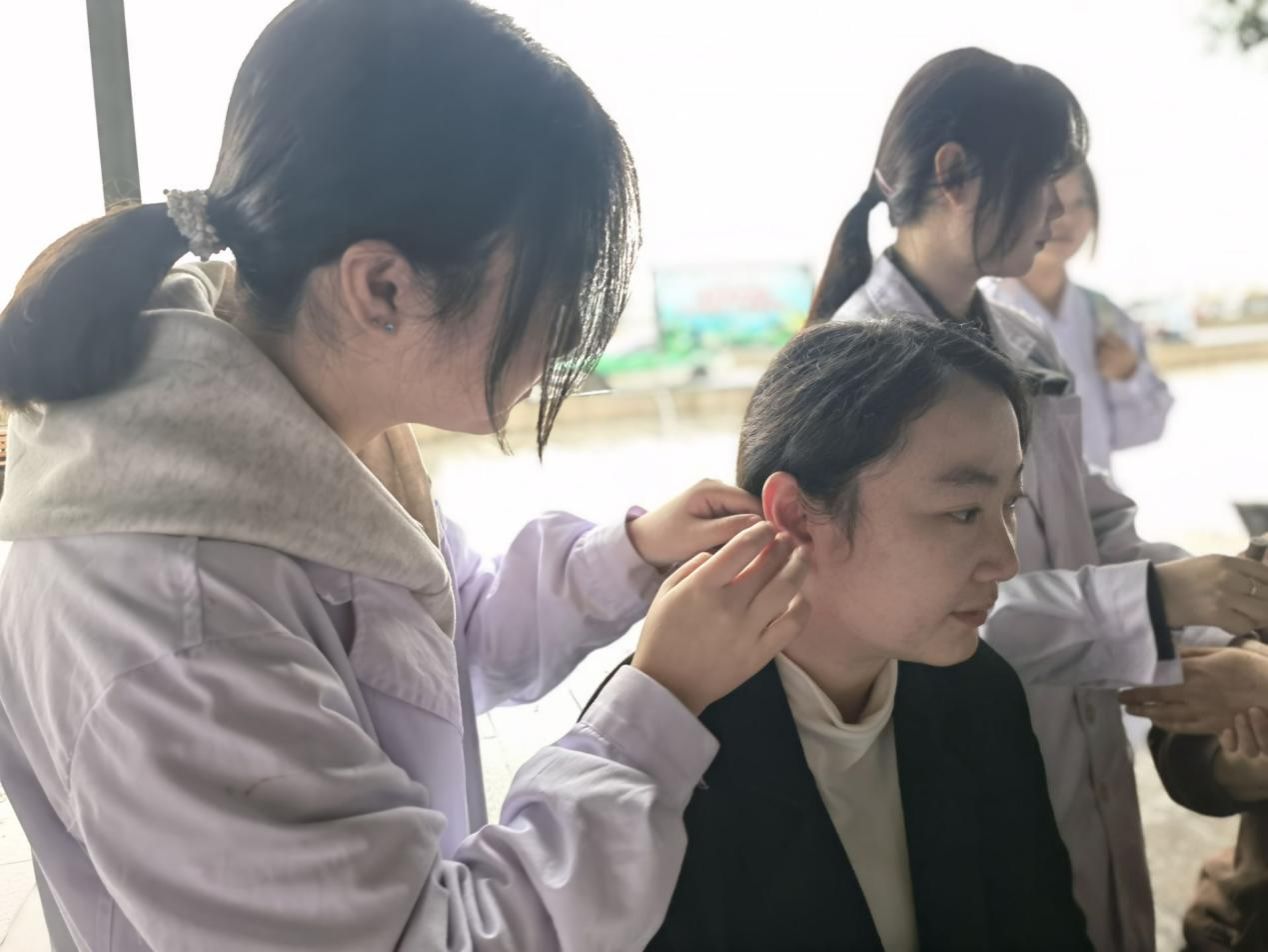 考虑到中老年群体的健康需求,志愿者团队特别设置血压测量专区:志愿者们耐心为居民测量血压、记录数值,针对血压异常情况,结合居民日常饮食、运动习惯给出个性化健康建议,并反复提醒需就医复查的居民及时就诊,切实规避健康风险。在艾灸体验区,志愿者根据居民体质差异与具体不适症状,精准选取穴位开展艾灸操作 —— 温热的艾绒缓缓释放功效,有效缓解了多位居民的关节疼痛、畏寒乏力等问题,不少居民体验后直言 “身体舒畅多了”,真切感受到中医理疗的独特魅力。耳穴体验区同样人气高涨,志愿者通过刺激耳部对应穴位,为受失眠、头痛困扰的居民调理身体,同时细致教授日常按压方法,方便居民居家开展健康保健。
