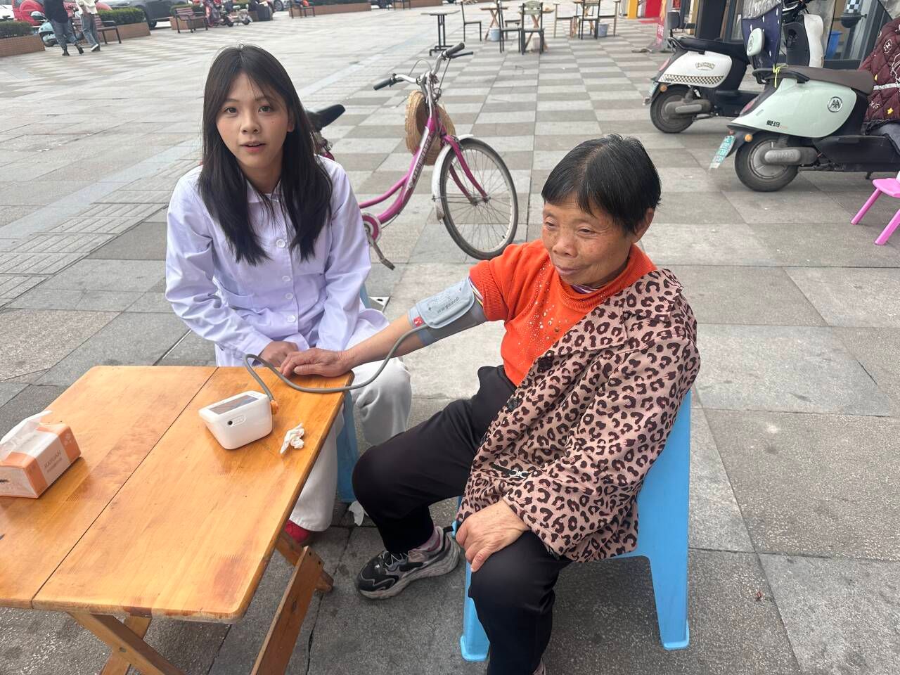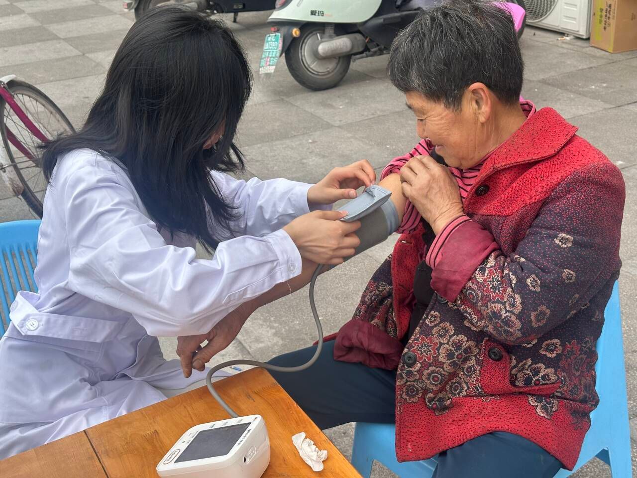 除广场服务外,师生还为社区高龄、独居老人提供上门血压测量服务,全程注重秩序引导、隐私保护与医疗应急准备,确保活动安全有序开展。