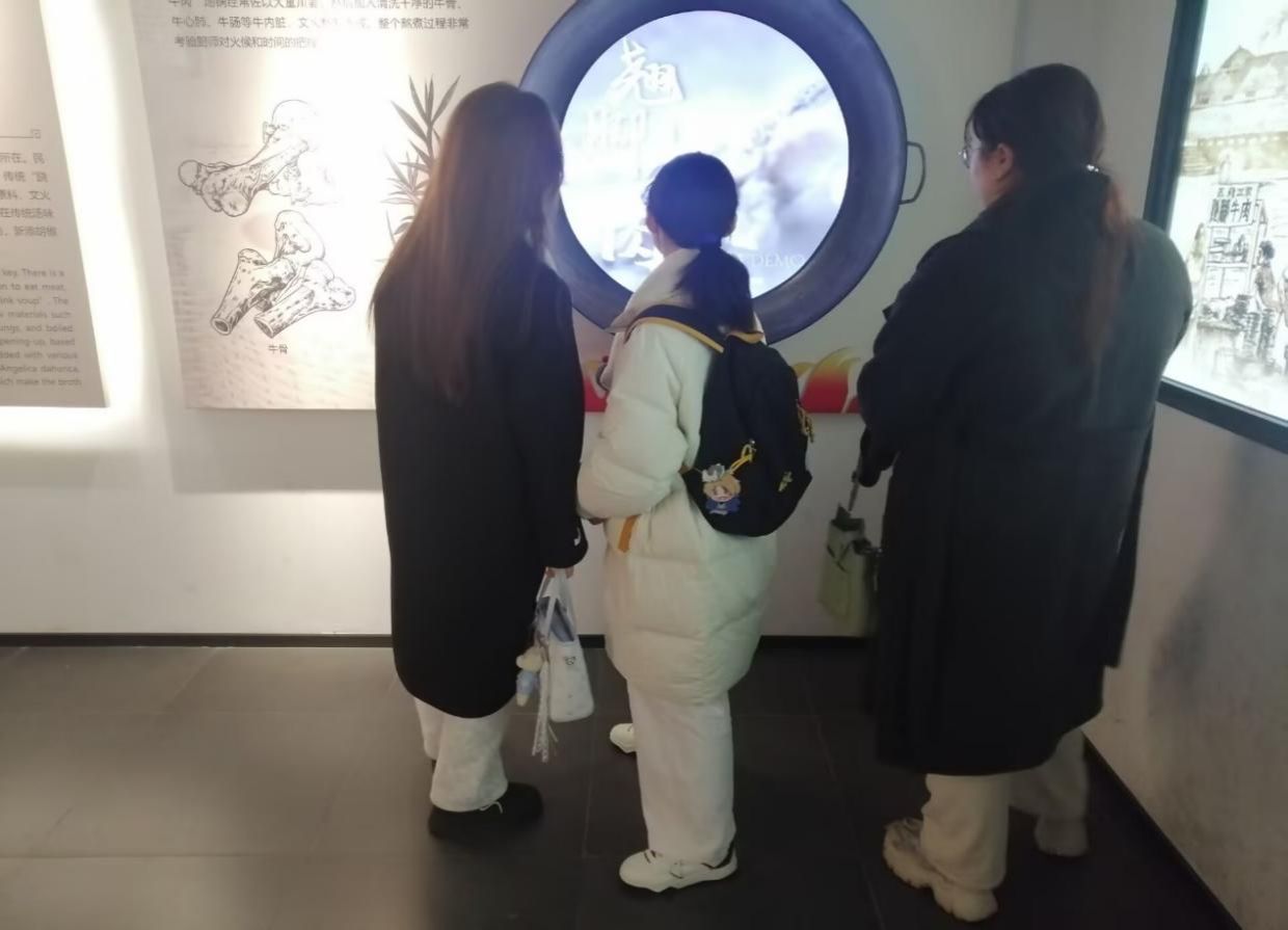 活动现场,同学们有序参观了历史溯源、技艺展示、文化传承等多个特色展区。透过一件件承载岁月的老物件、一帧帧详实的文字史料、一幕幕鲜活的场景复原,大家深入了解了翘脚牛肉从市井街头小吃逐步发展为非遗文化瑰宝的完整历程,深刻体悟到其“药食同源”的独特文化内核,以及传承百年的精湛烹饪技艺。参观过程中,同学们认真记录见闻,踊跃交流感悟,现场学习氛围浓厚。
