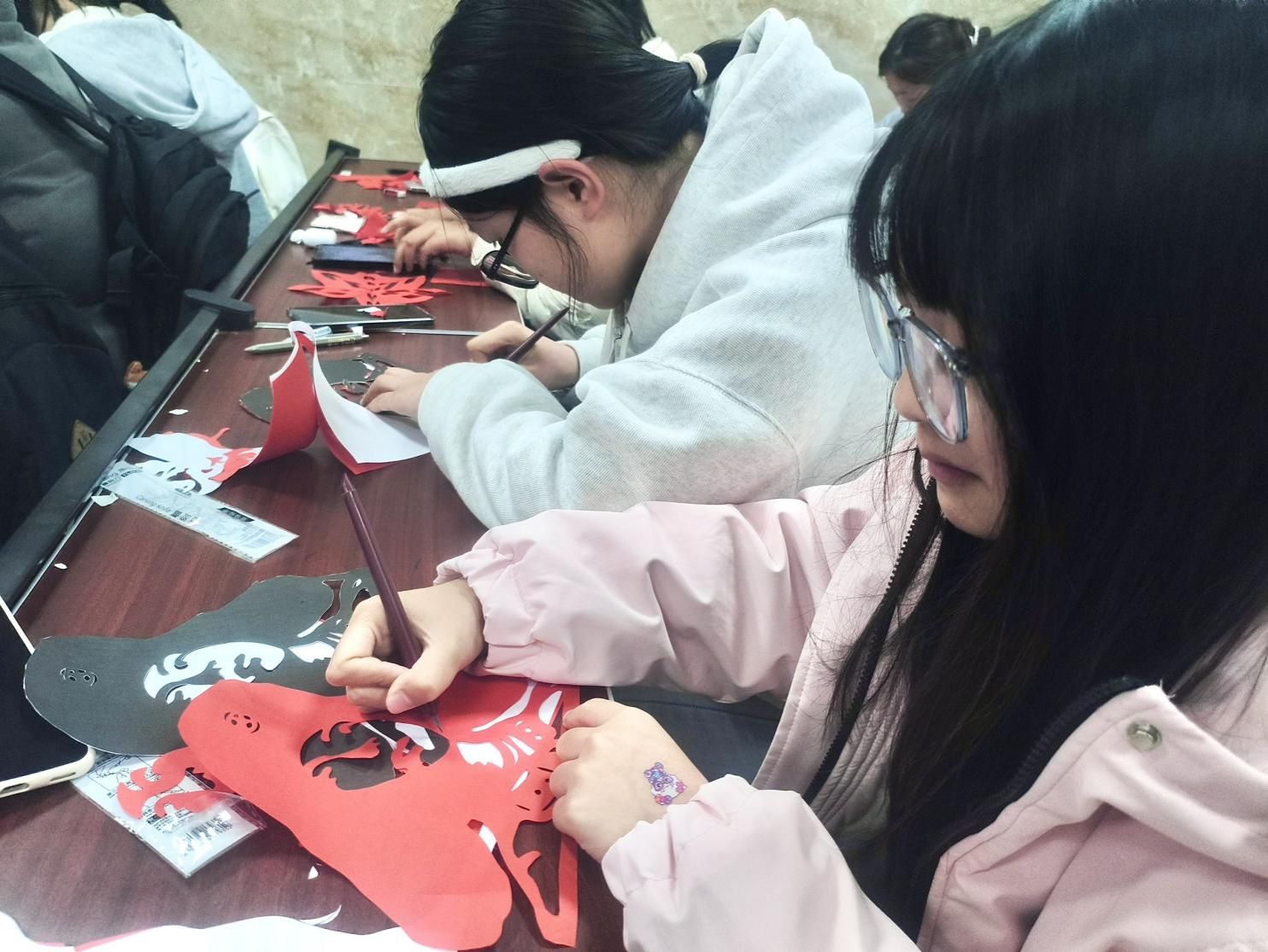 本次活动巧妙将非遗剪纸技艺与学雷锋实践相结合,让传统文化成为弘扬雷锋精神的鲜活载体。活动现场,同学们手持剪刀、刻刀,以红纸为媒,在专业工作人员的细致指导下,潜心学习传统剪纸技法,从勾勒纹样到精细裁剪,一步步感受非遗文化的独特魅力。大家紧扣活动主题,精心创作窗花、爱心图案、雷锋肖像等作品,将对雷锋精神的敬仰融入每一刀、每一剪。