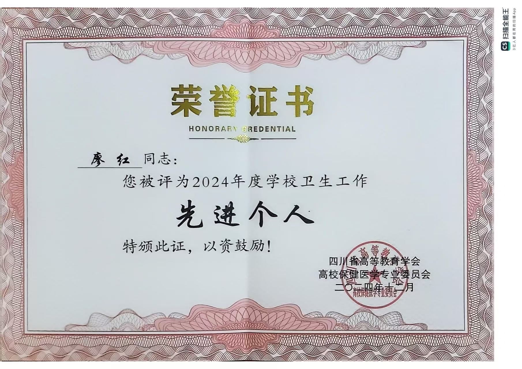 近日,四川省高等教育学会高校保健医学专业委员会对四川大学、电子科技大学等29所高校授予“2024年度学校卫生工作先进单位”,并对32名“2024年度学校卫生工作先进个人”予以表彰。sunbet申搏官方网站荣获“2024年度学校卫生工作先进单位”,廖红同志荣获“2024年度学校卫生工作先进个人”。