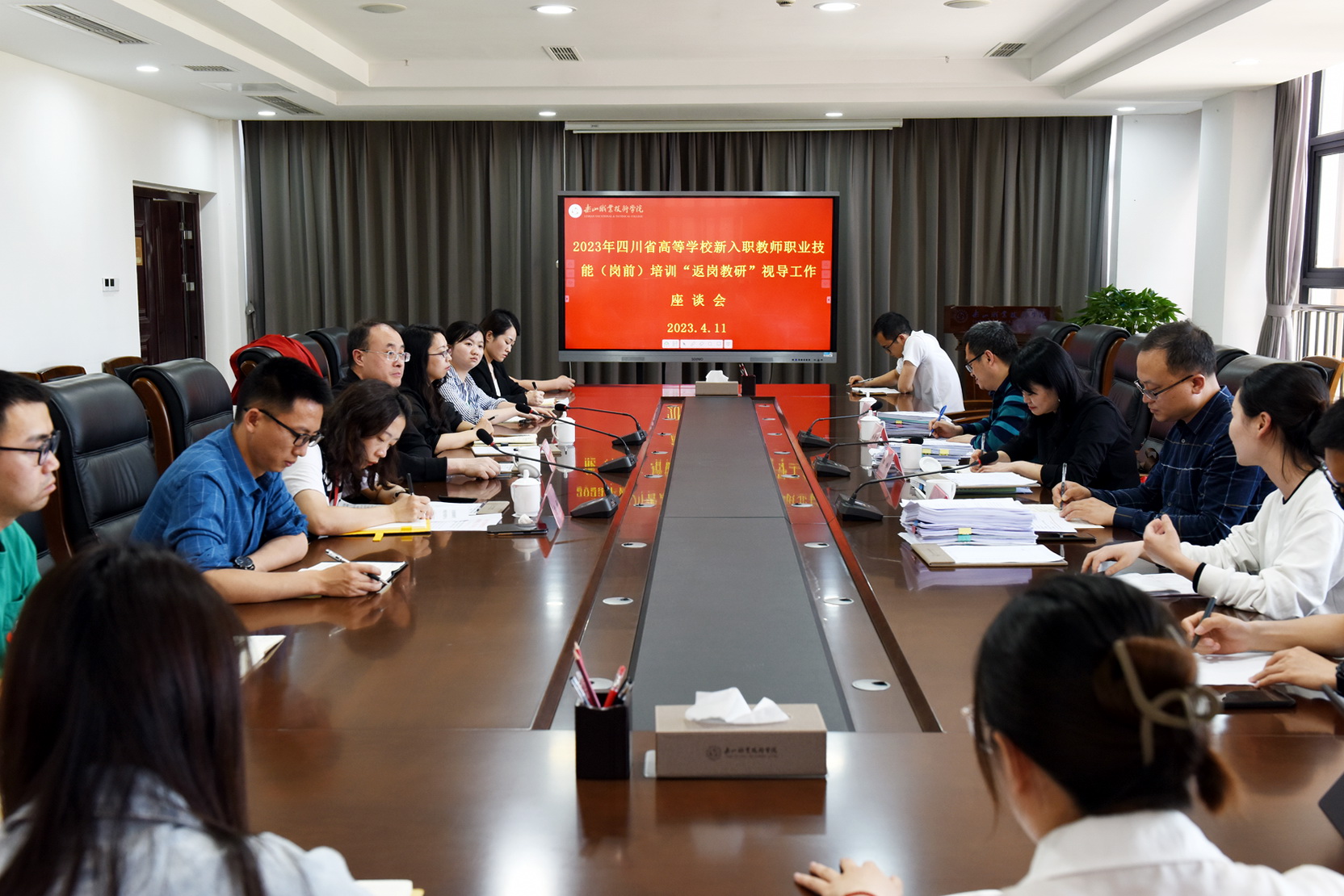 4月11日,四川省教师继续教育西华师范大学培训中心来我院开展2022年度四川省高等学校新入职教师职业技能(岗前)培训项目“线上学习”和“返岗教研”阶段视导工作,并在学术交流中心2001会议室召开岗培教师座谈会。sunbet申搏官方网站院长刘忠,副院长周芹出席座谈,人事处副处长(主持工作)应桦,2022年返岗研修学员参加座谈。