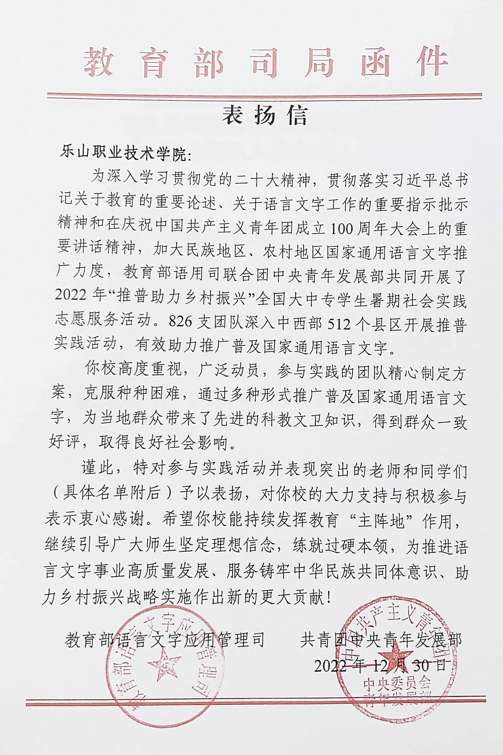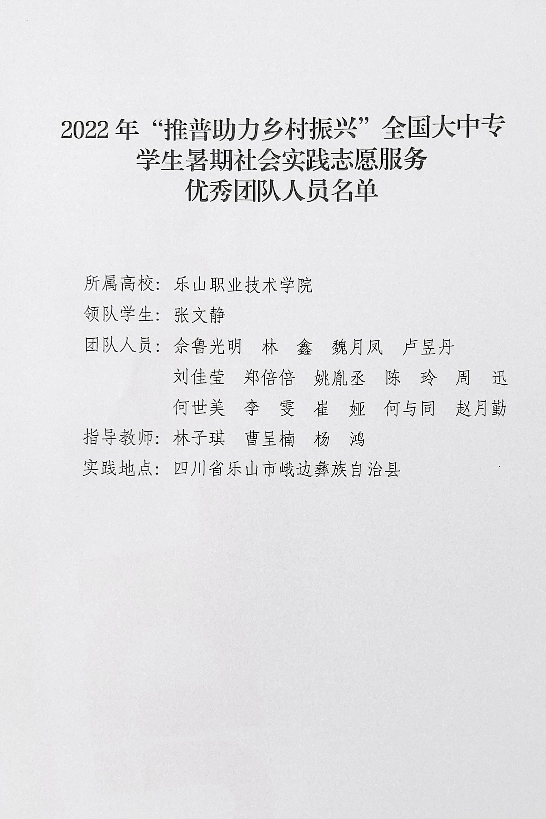 近日,教育部2022年“推普助力乡村振兴”全国大中专学生暑期社会实践志愿服务活动公布评优结果,我院彝乡推普志愿服务队获评“优秀团队”,并被教育部语言文字应用管理司、共青团中央青年发展部来信表扬。