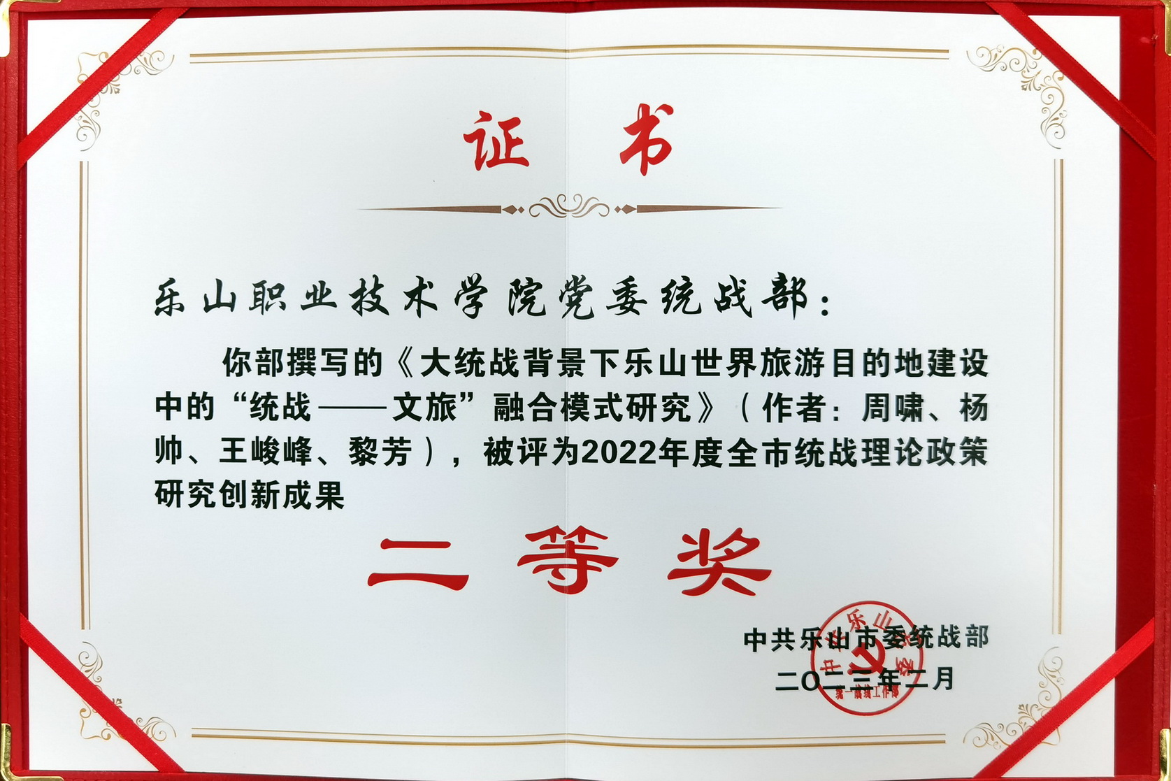 2月17日,全市统战部长会议在市委党校召开,会议对2022年度全市统战理论政策研究创新成果获奖篇目作了通报。我院杨鸿撰写的《“万企兴万村”行动路径研究》获评2022年度全市统战理论政策研究创新成果一等奖;周啸、杨帅、王峻峰、黎芳撰写的《大统战背景下乐山世界旅游目的地建设中的“统战——文旅”融合模式研究》获评二等奖。
