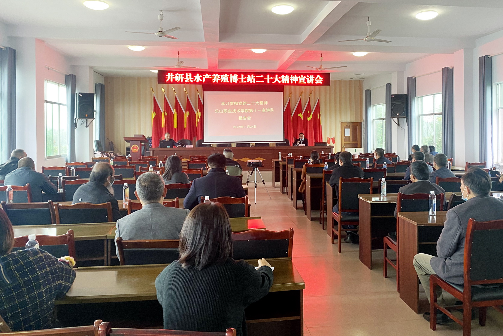 11月24日上午,学习贯彻党的二十大精神sunbet申搏官方网站第十一宣讲队唐勇博士到井研县纯复镇水产博士工作站,作了题为《继往开来谋新篇,奋进中国式现代化》的宣讲报告。报告会在井研县纯复镇人民政府四楼会议室举行,纯复镇党委和政府相关人员、各村代表及水产养殖业主代表40余人参加报告会,报告会由纯复镇党委副书记、镇长邹东良主持。